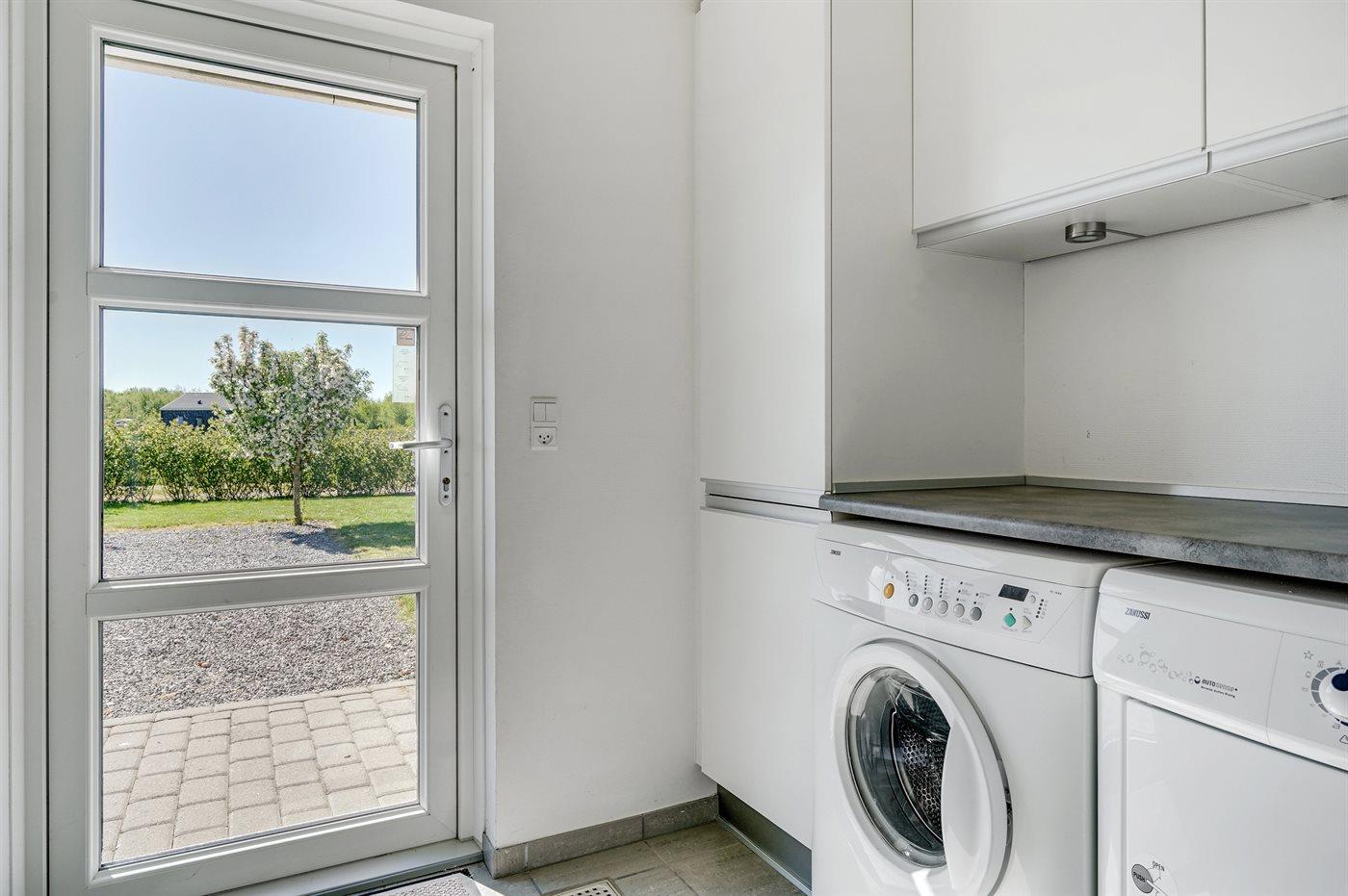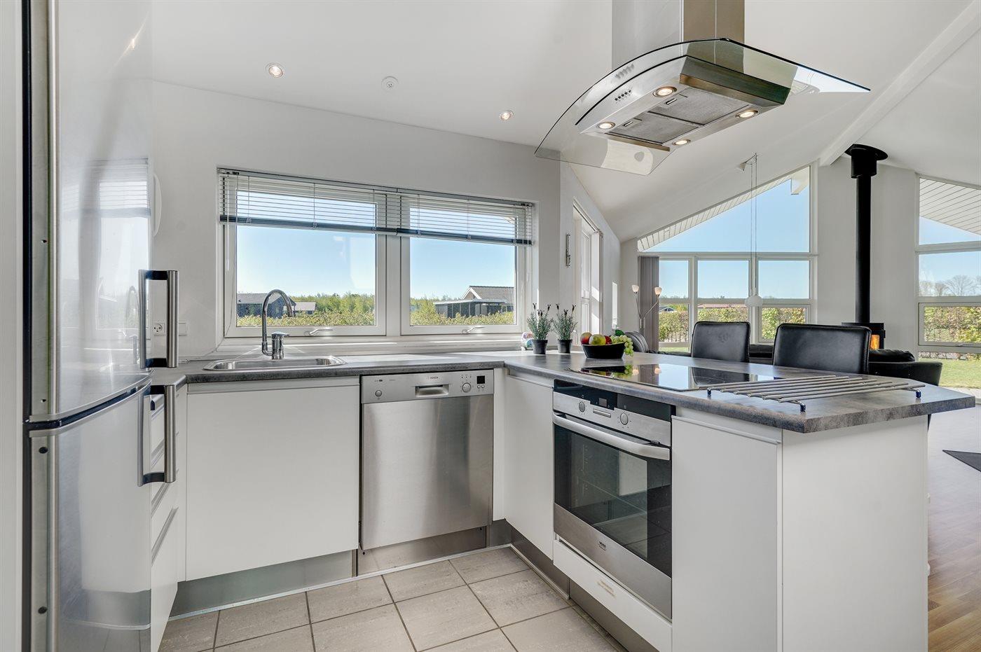 Køkkenet er udstyret med 1 køleskab. Der er 4 keramiske kogeplader, varmluftovn, mikrobølgeovn samt opvaskemaskine Der er gulvvarme i køkkenet.