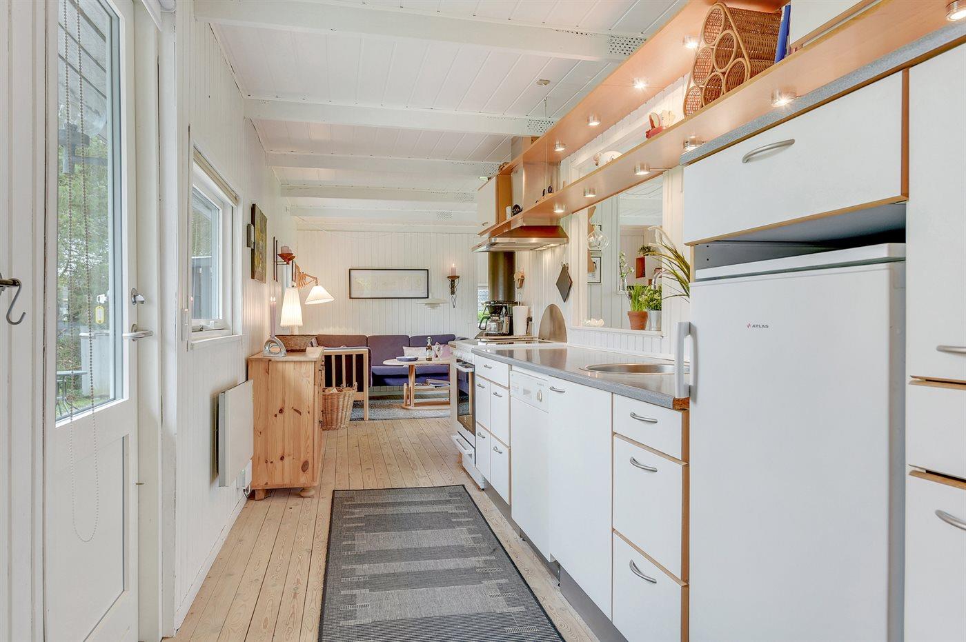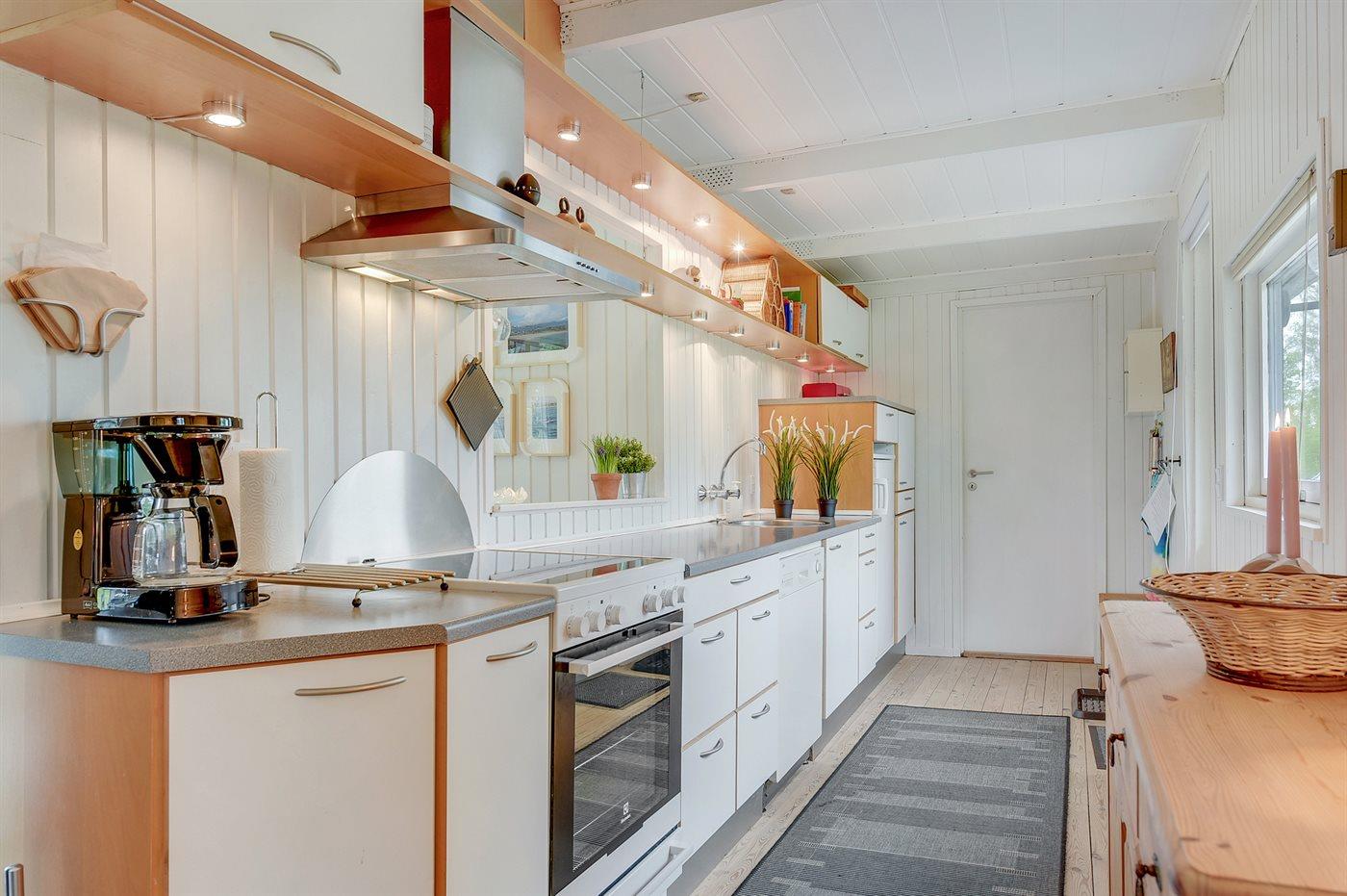 Køkkenet er udstyret med 1 køleskab. Der er 4 keramiske kogeplader, varmluftovn, mikrobølgeovn samt opvaskemaskine.