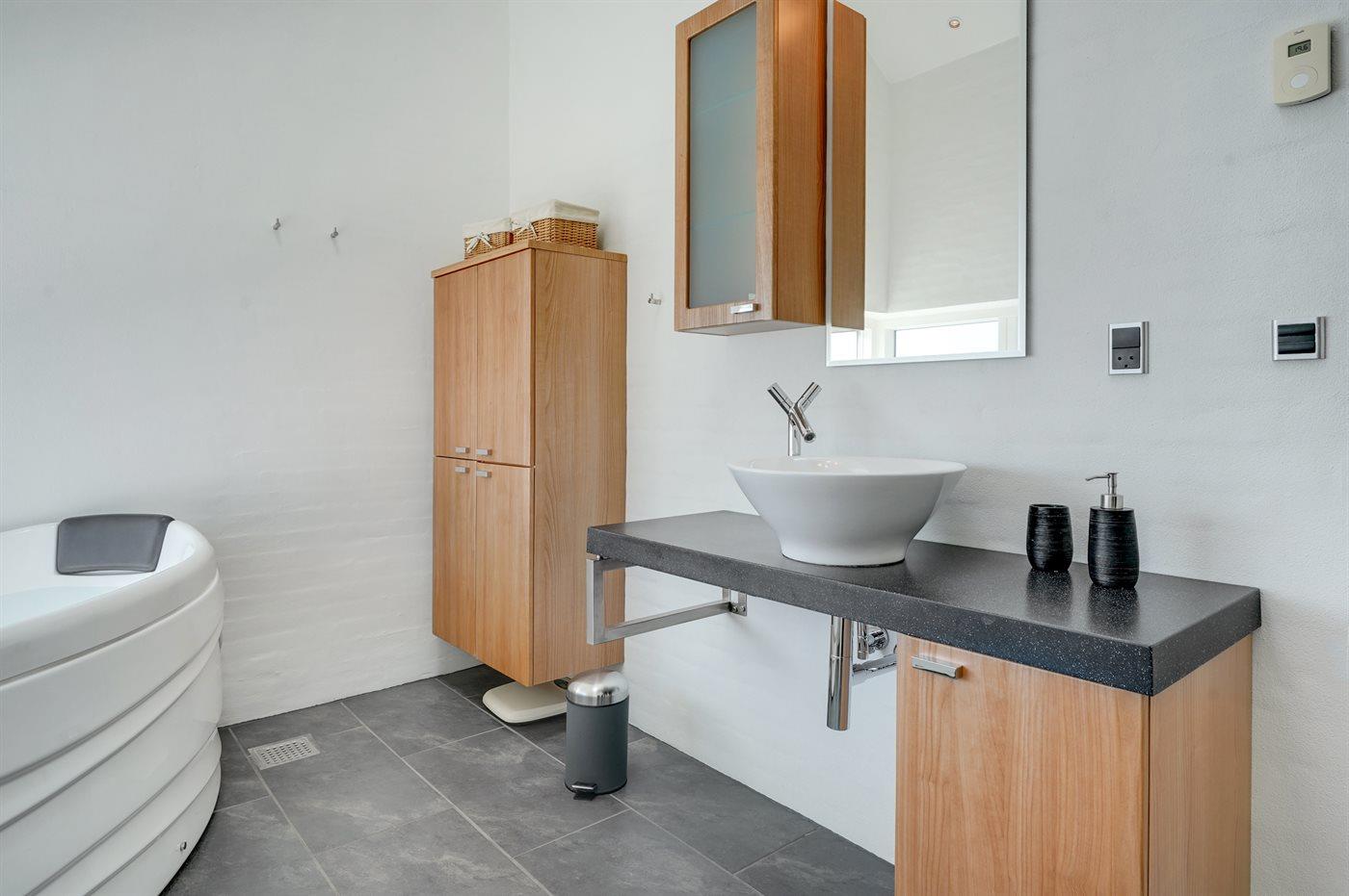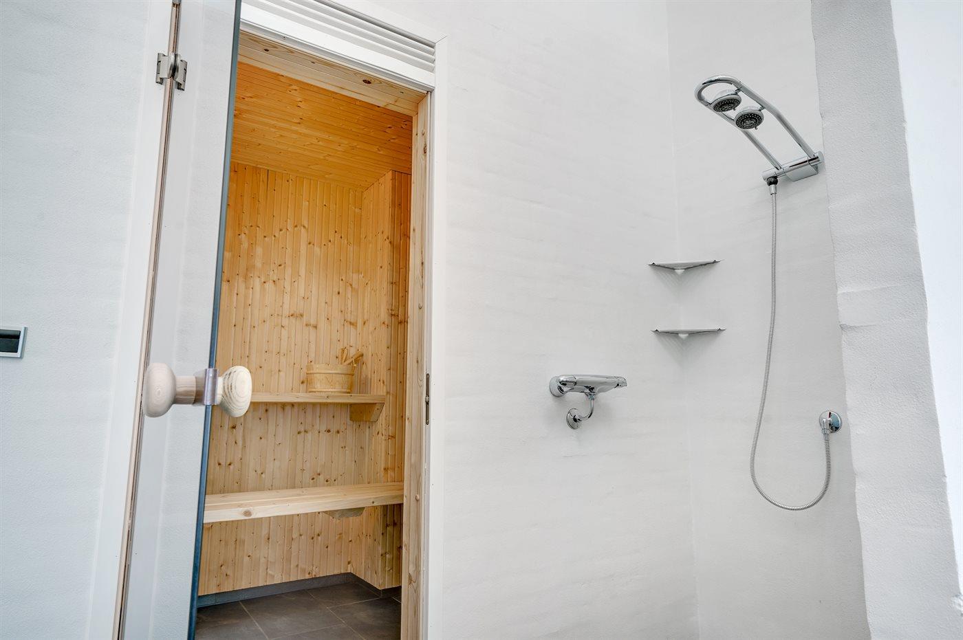 Der er 2 badeværelser med bruseniche og 2 toiletter. Der er gulvvarme på 2 badeværelser. I saunaen er der mulighed for afslapning.