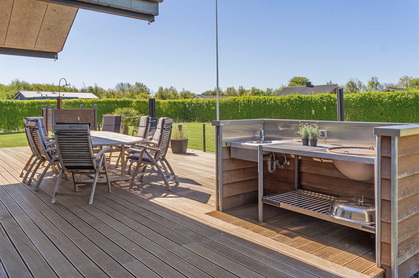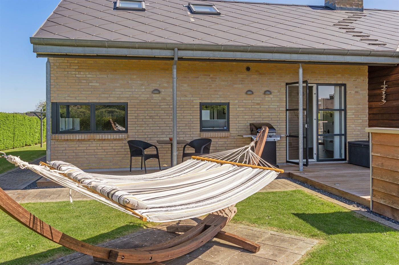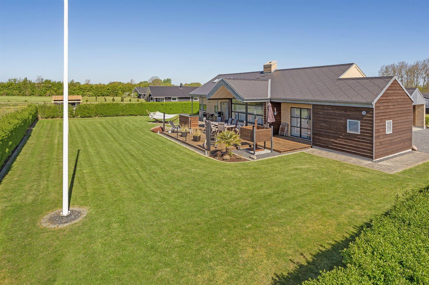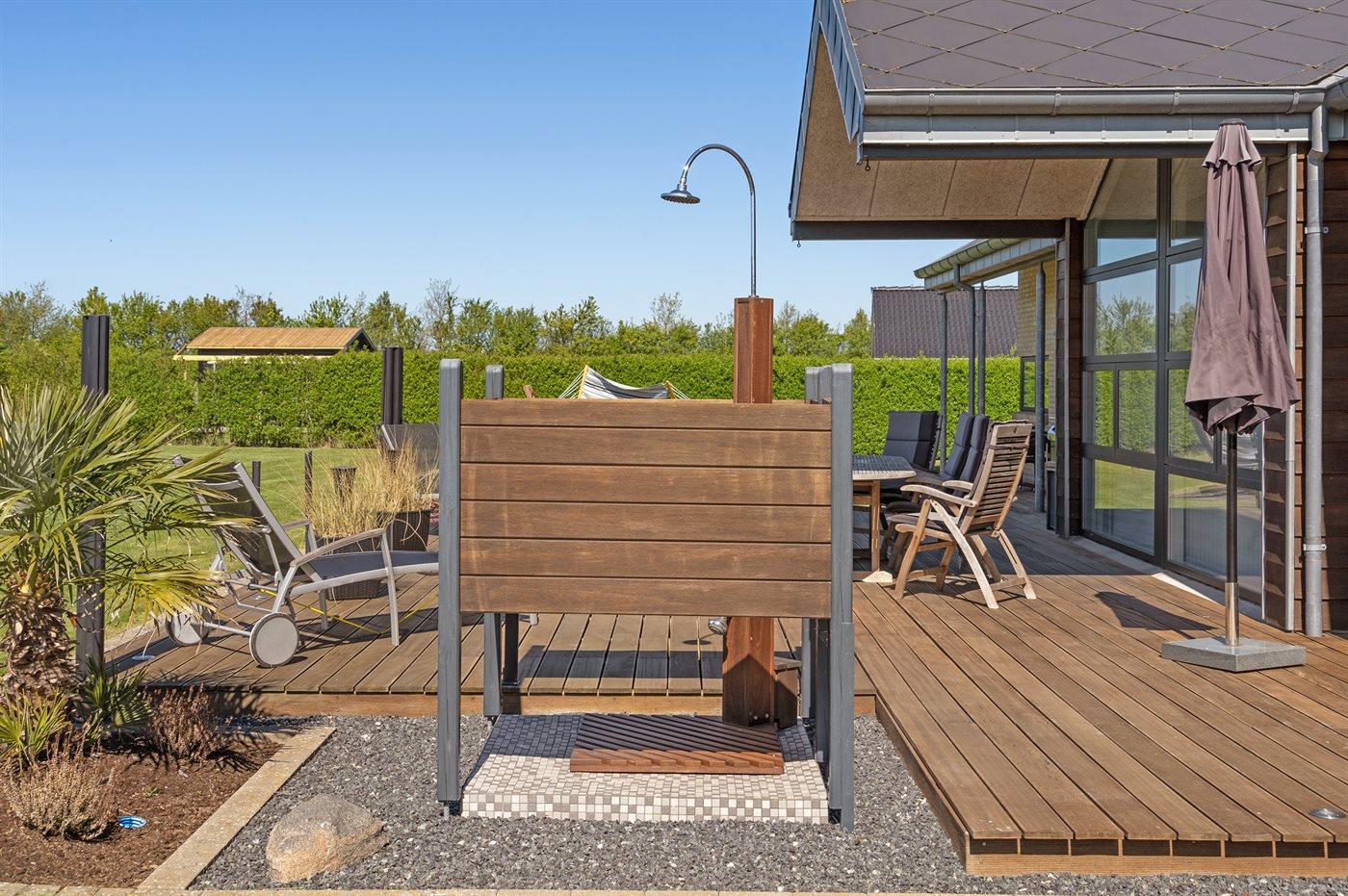 Ferieboligen er beliggende på en 1098 m² stor havegrund. Der er 700 m til havet. Nærmeste forretning er beliggende i en afstand af 2000 m. Til ferieboligen hører 50 m² terrasseareal. Desuden er der 8 m² overdækket terrasse. Der er redskabsrum. Legetårn. Udendørs bruser. Der er mulighed for at tilberede maden udendørs i udekøkkenet. Grill til rådighed. Der er garage til rådighed. Der er carport til rådighed. Parkering ved ferieboligen.