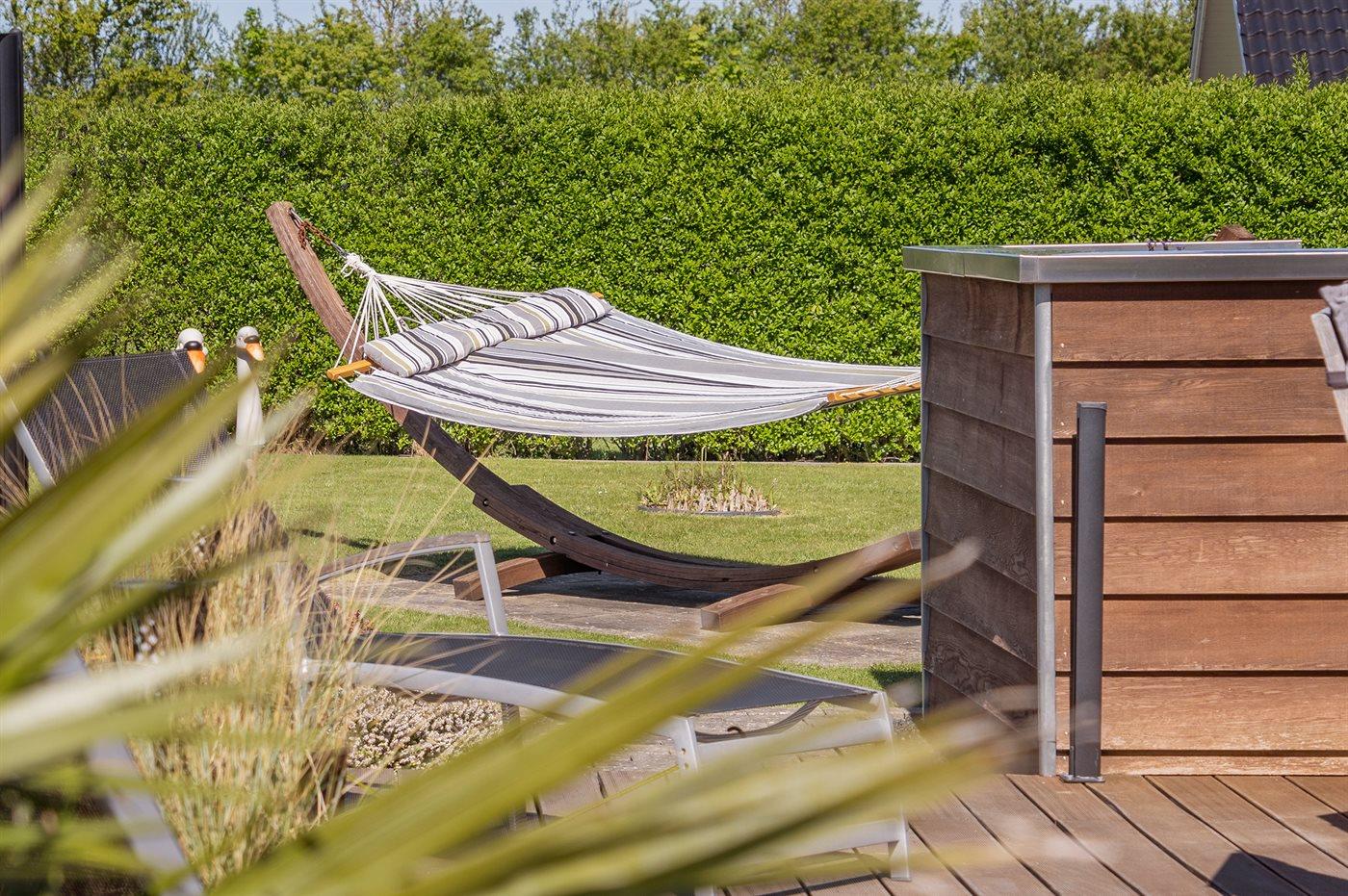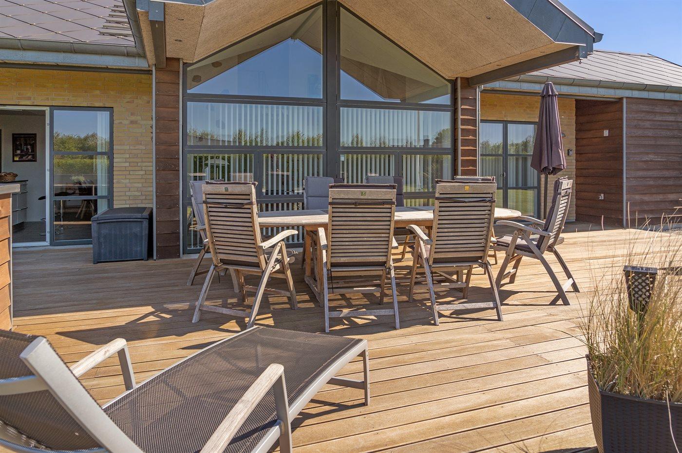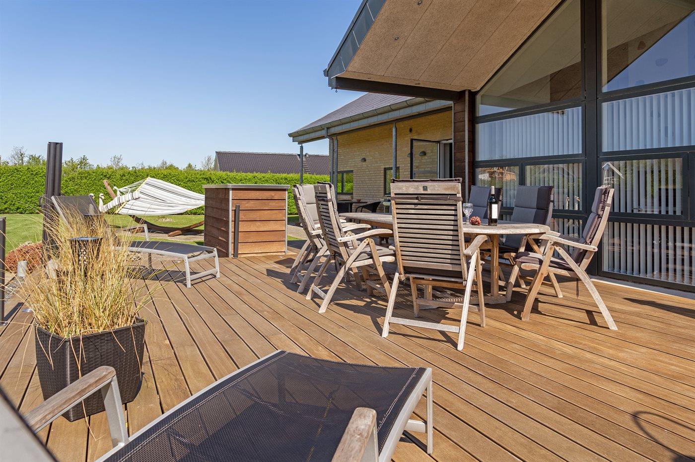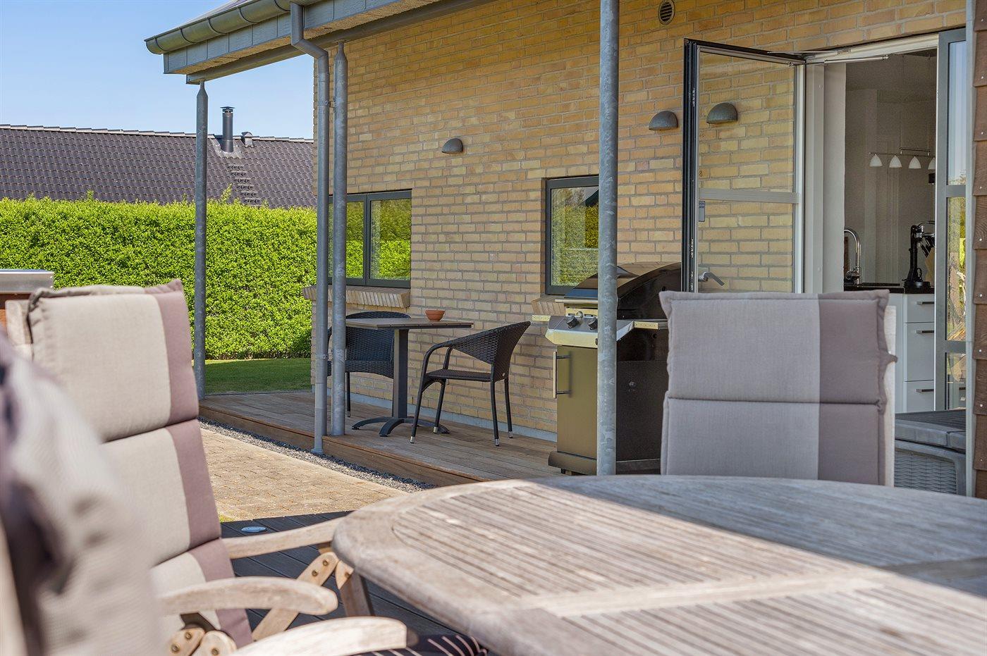 Ferieboligen er beliggende på en 1098 m² stor havegrund. Der er 700 m til havet. Nærmeste forretning er beliggende i en afstand af 2000 m. Til ferieboligen hører 50 m² terrasseareal. Desuden er der 8 m² overdækket terrasse. Der er redskabsrum. Legetårn. Udendørs bruser. Der er mulighed for at tilberede maden udendørs i udekøkkenet. Grill til rådighed. Der er garage til rådighed. Der er carport til rådighed. Parkering ved ferieboligen.