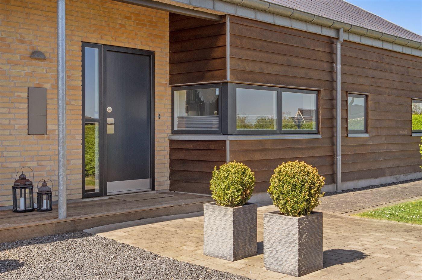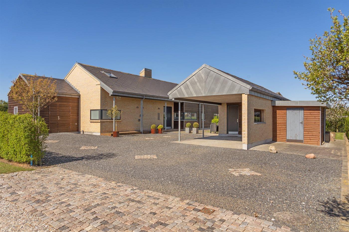Flot, arkitekttegnet sommerhus med god plads opført i mursten kombineret med Canadisk-cedertræ. Sommerhuset ligger kun 8 minutters gang fra en af områdets bedste badestrande. Indvendigt er huset indrettet lyst og indbydende med et dejlige lysindfald via store vinduespartier samt en moderne indbygget pejs midt i stuen. Huset har eget spillerum i forlængelse af garagen.