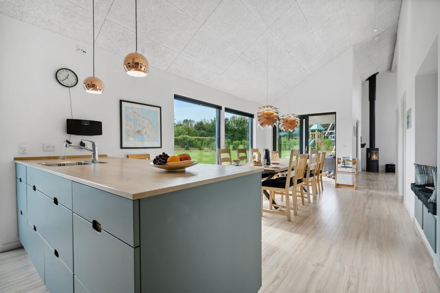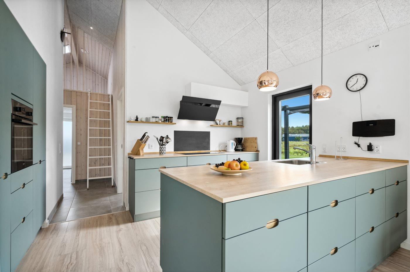 Køkkenet er udstyret med 1 køleskab. Der er 4 induktionskogeplader, varmluftovn, mikrobølgeovn samt opvaskemaskine.