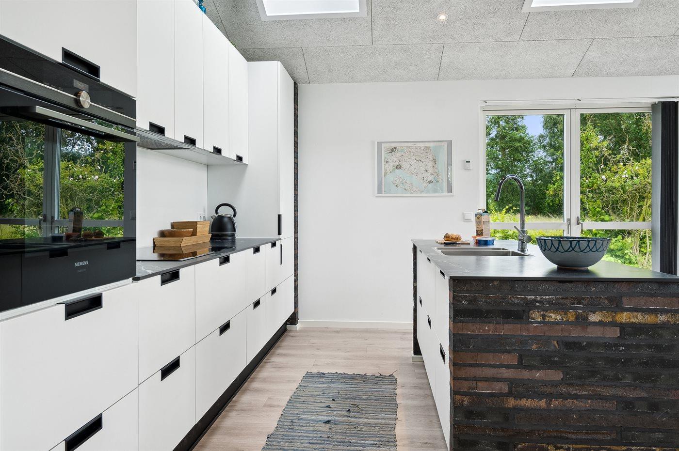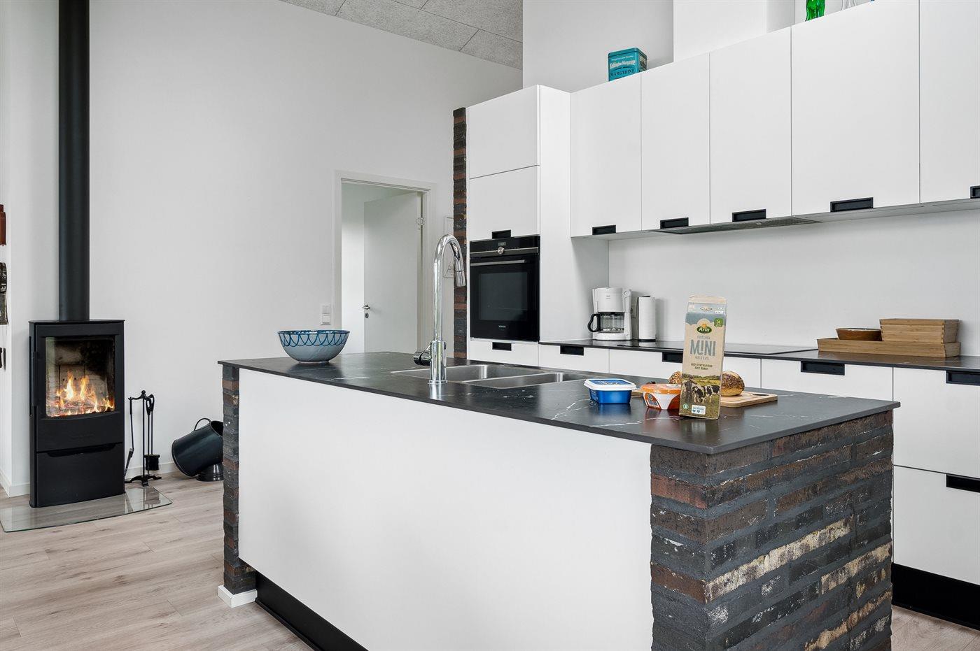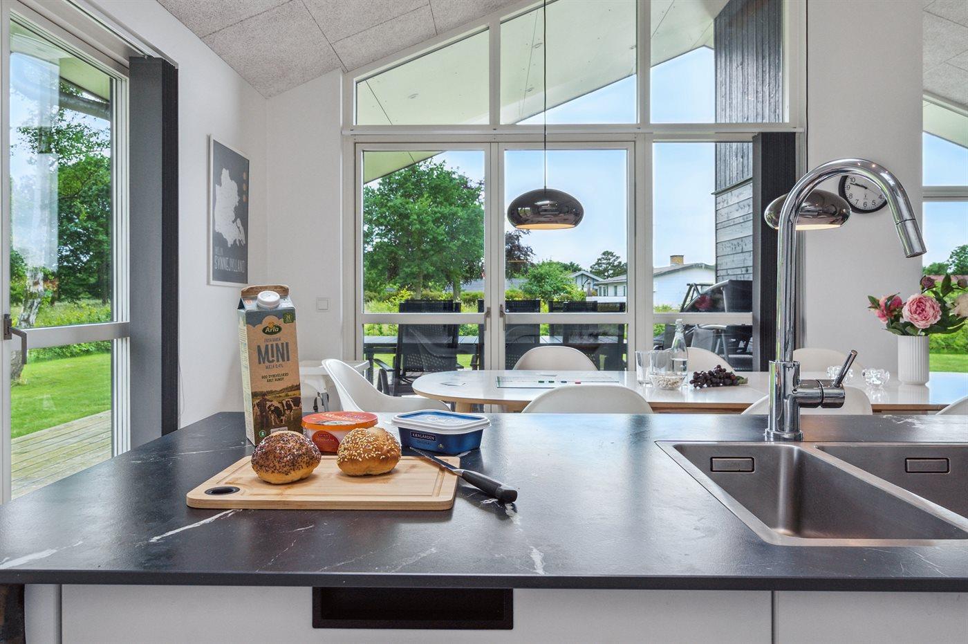 Køkkenet er udstyret med 1 køleskab. Der er 4 induktionskogeplader, varmluftovn, mikrobølgeovn samt opvaskemaskine.