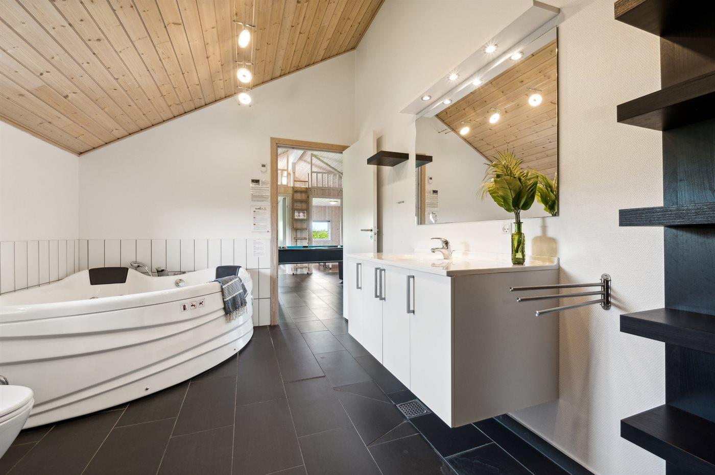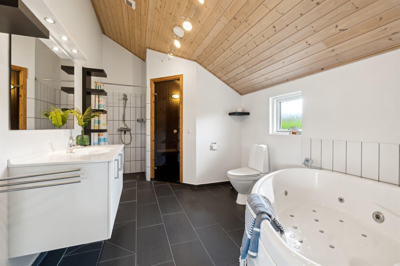 Der er 2 badeværelser med bruseniche og 2 toiletter. Der er gulvvarme på 2 badeværelser. I saunaen er der mulighed for afslapning.