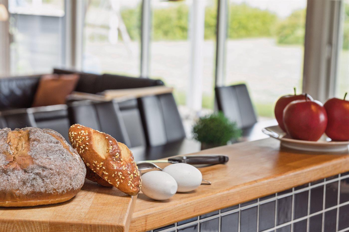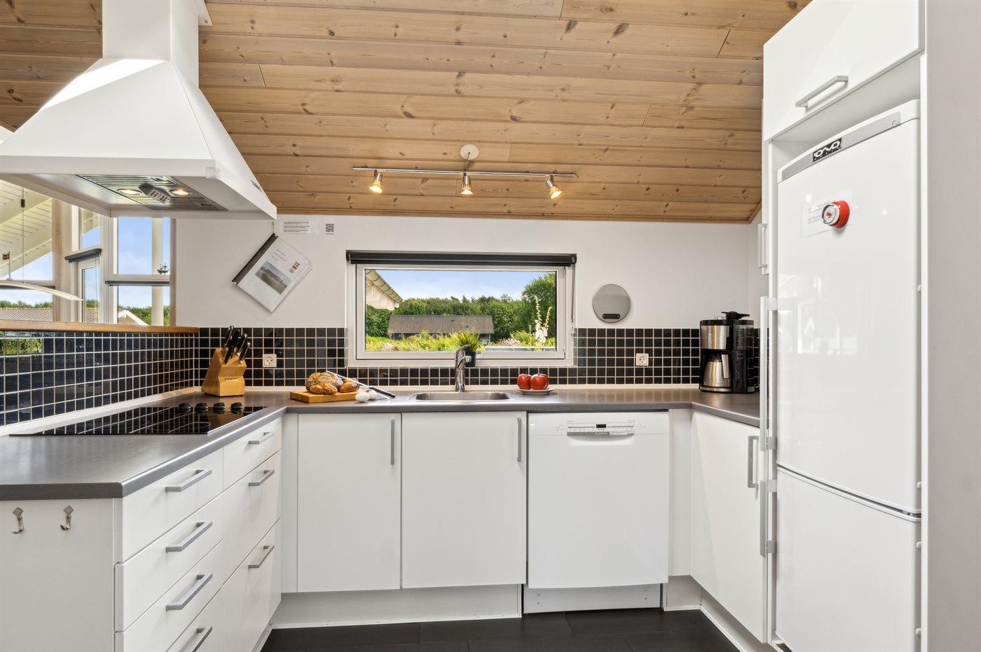 Køkkenet er udstyret med 1 køleskab. Der er 4 keramiske kogeplader, varmluftovn, mikrobølgeovn samt opvaskemaskine.