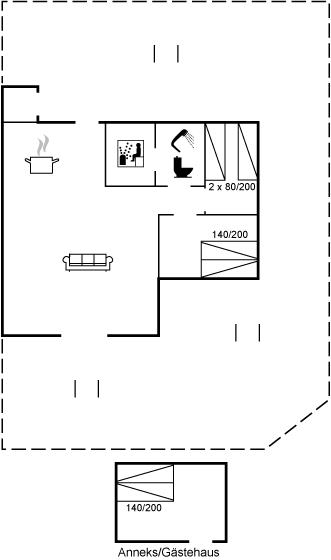 Der er 1 badeværelse med bruseniche og 1 toilet. I saunaen er der mulighed for afslapning.