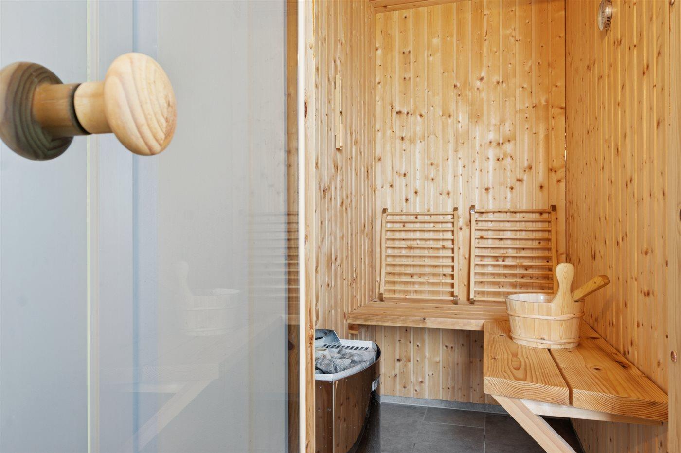 Der er 2 badeværelser med bruseniche og 2 toiletter. Der er gulvvarme på 2 badeværelser. I saunaen er der mulighed for afslapning.