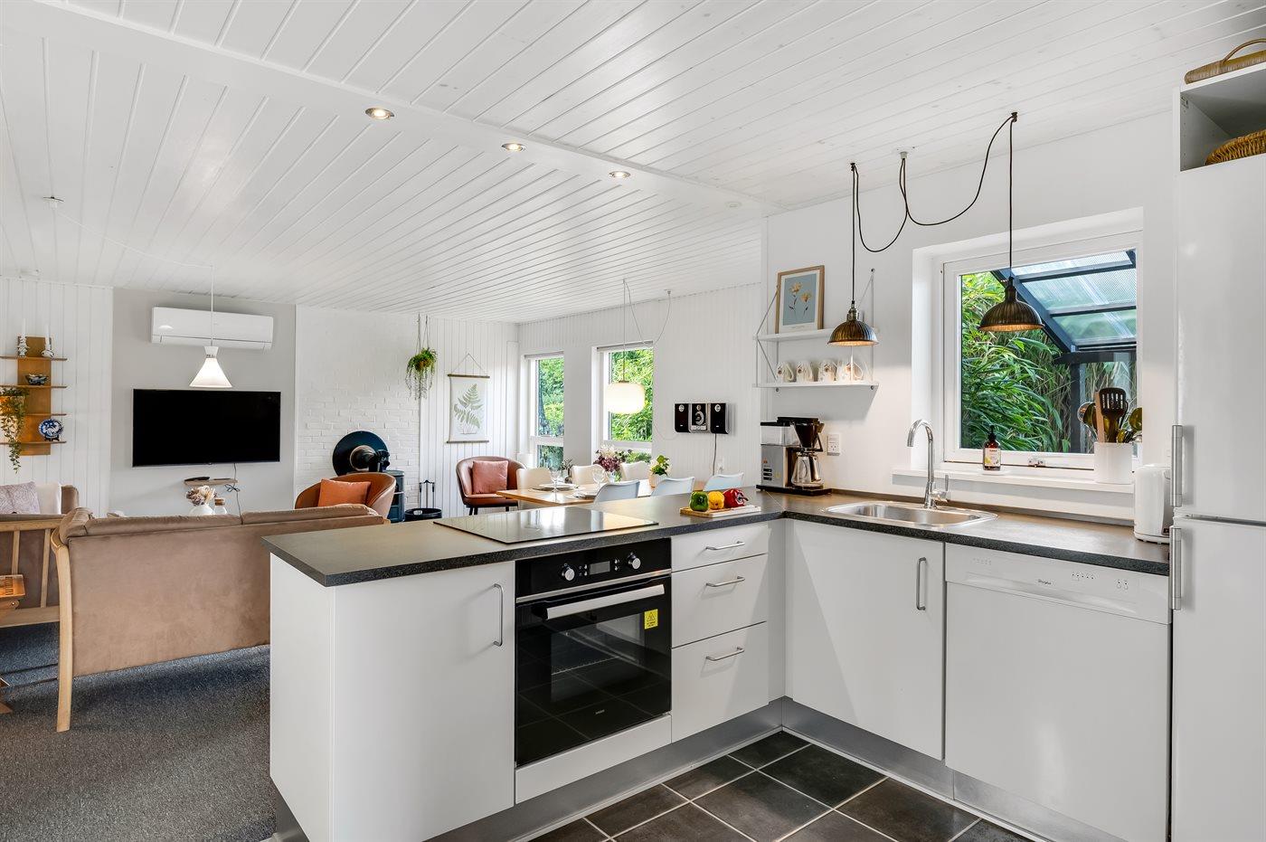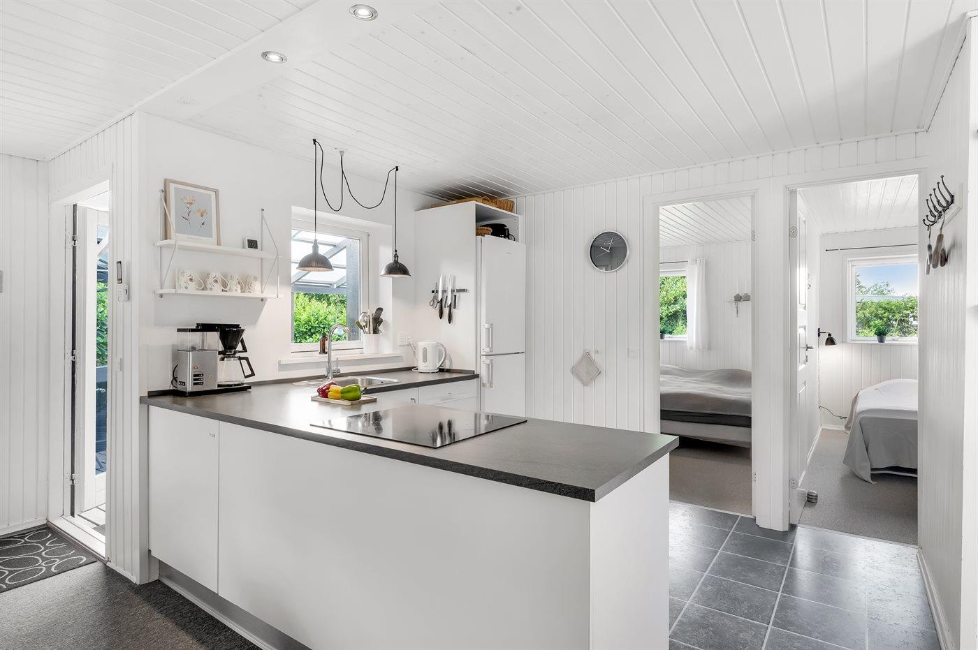 Køkkenet er udstyret med 1 køleskab. Der er 4 keramiske kogeplader, varmluftovn, mikrobølgeovn samt opvaskemaskine.