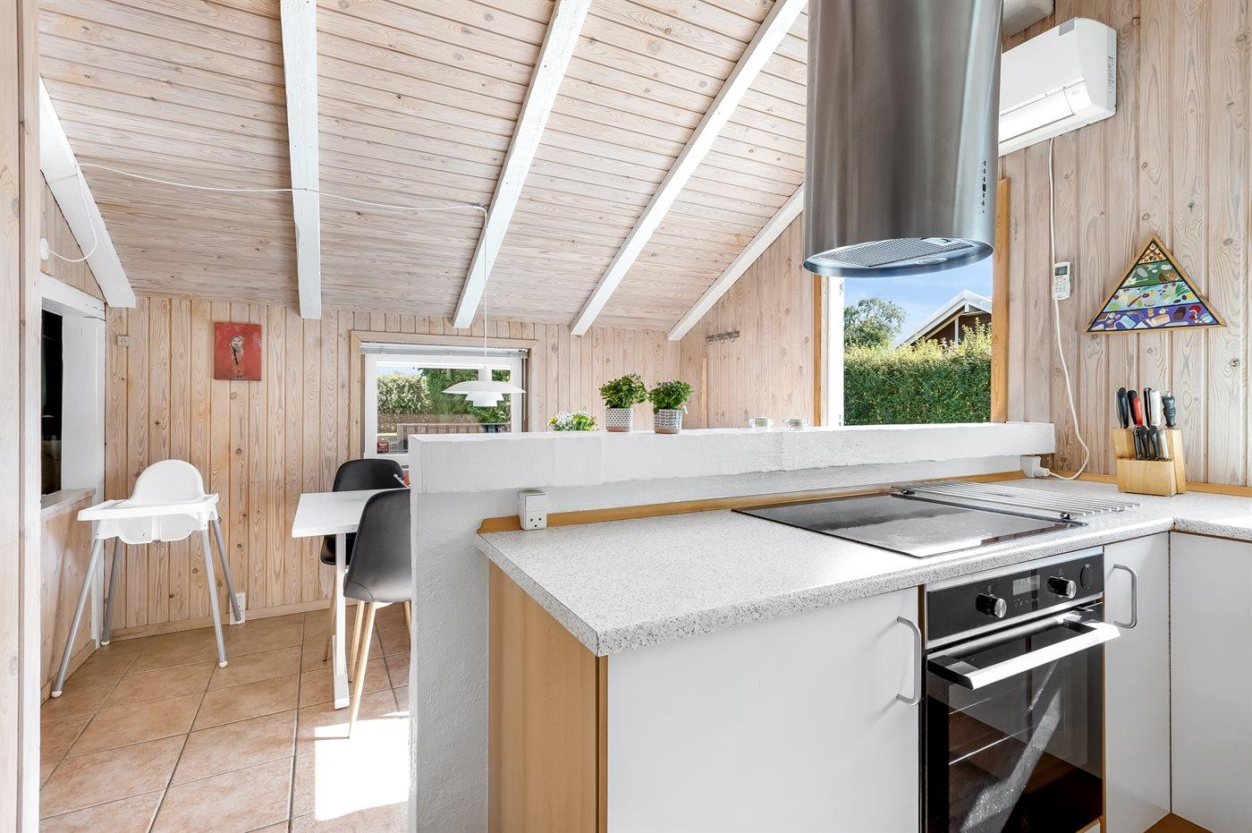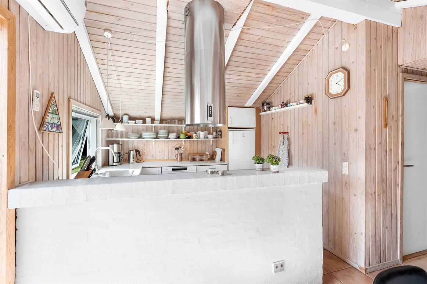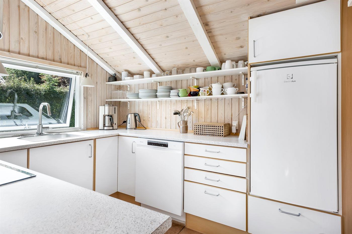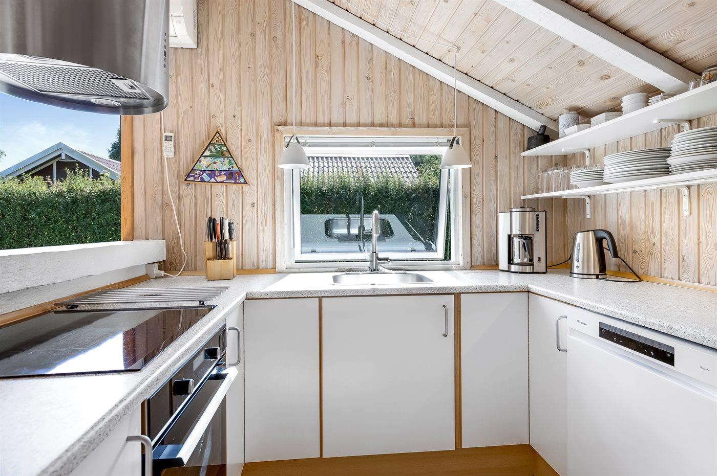 Køkkenet er udstyret med 1 køleskab. Der er 4 induktionskogeplader, varmluftovn, mikrobølgeovn, Airfryer samt opvaskemaskine Der er gulvvarme i køkkenet.