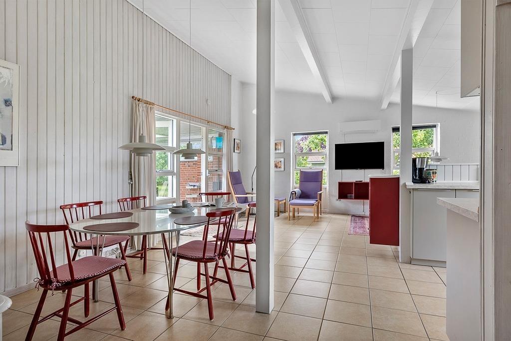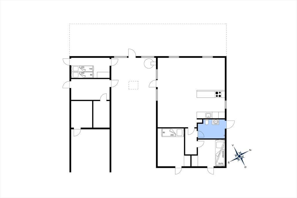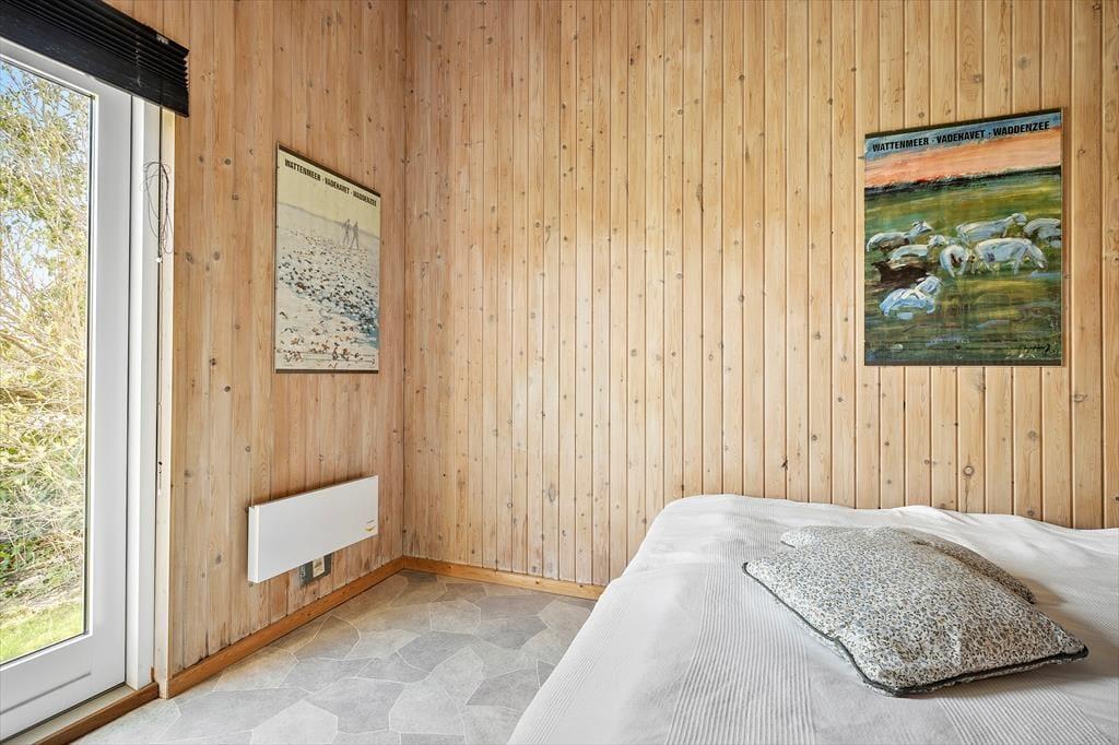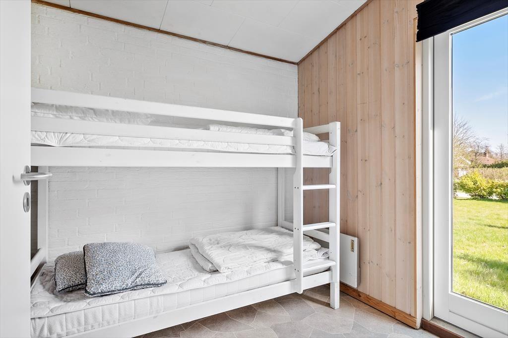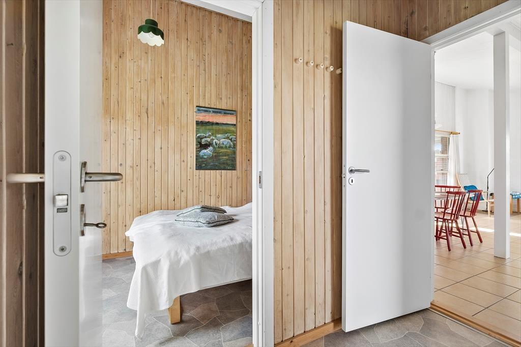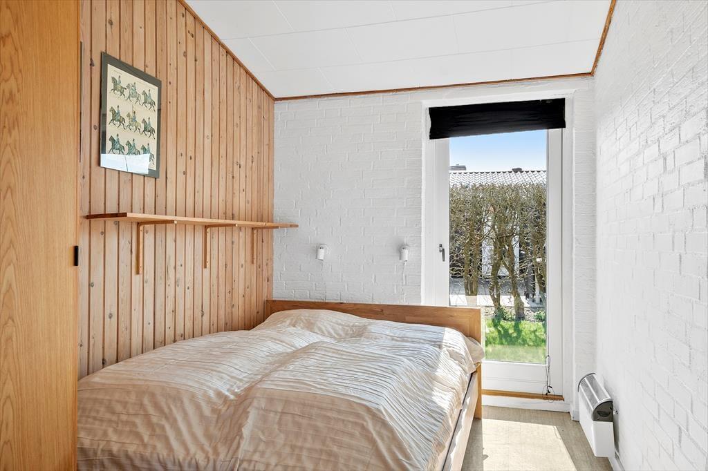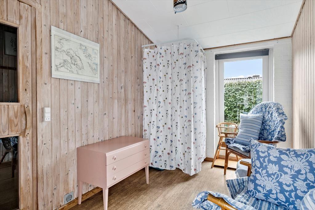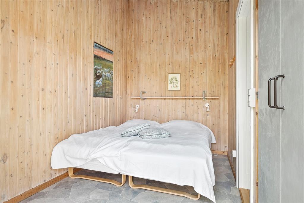 Dette spændende sommerhus indeholder et køkken i åben forbindelse med spise- og opholdsstuen med energibesparende varmepumpe. Derudover er der et badeværelse, et soveværelse med to enkeltsenge, et værelse med køjeseng. Fra begge soverum er der egen udgang til haven. Fra terrassen er der adgang til en anneksbygning med yderligere et værelse med dobbeltseng samt et særskilt rum med sauna.