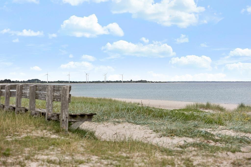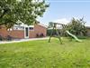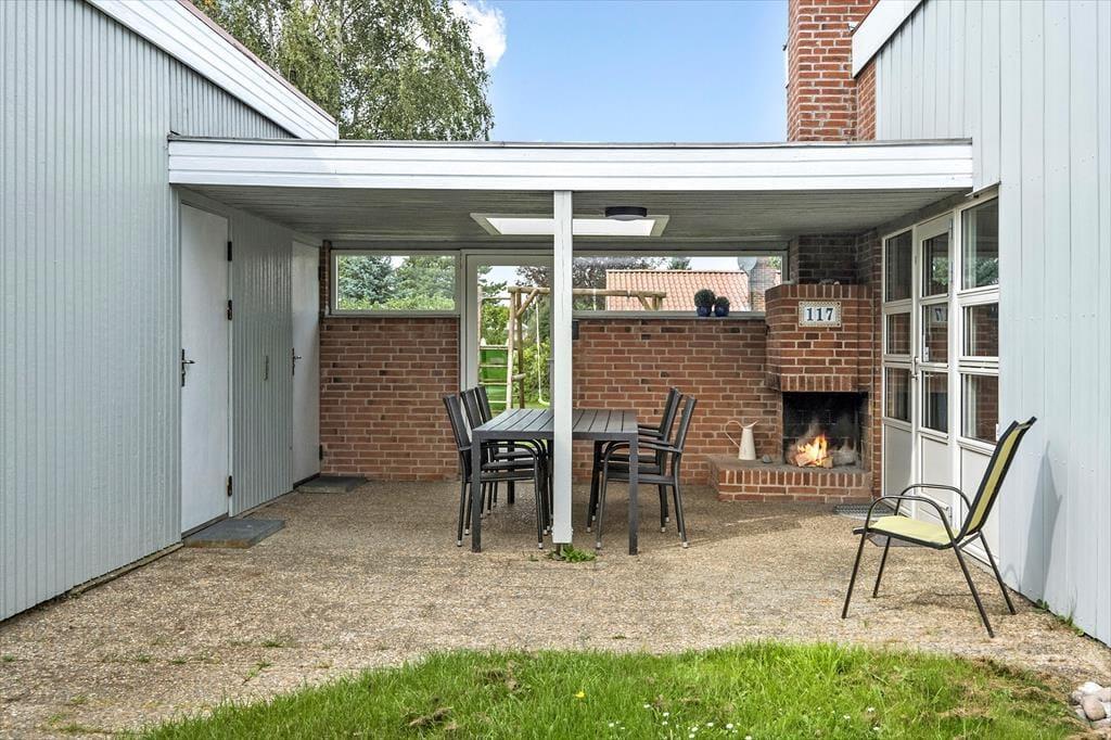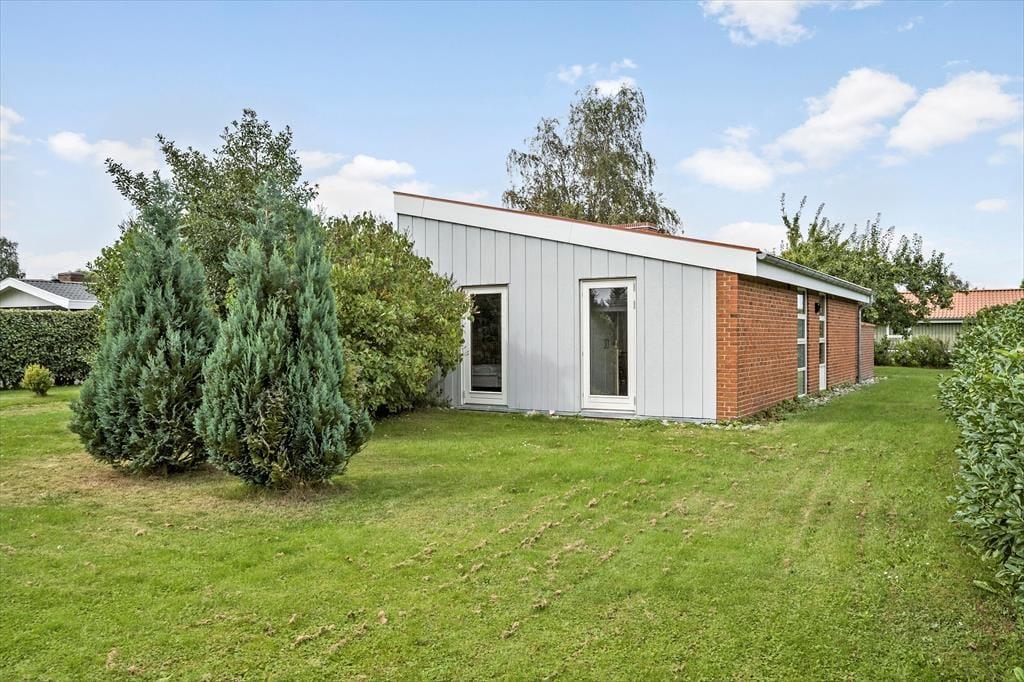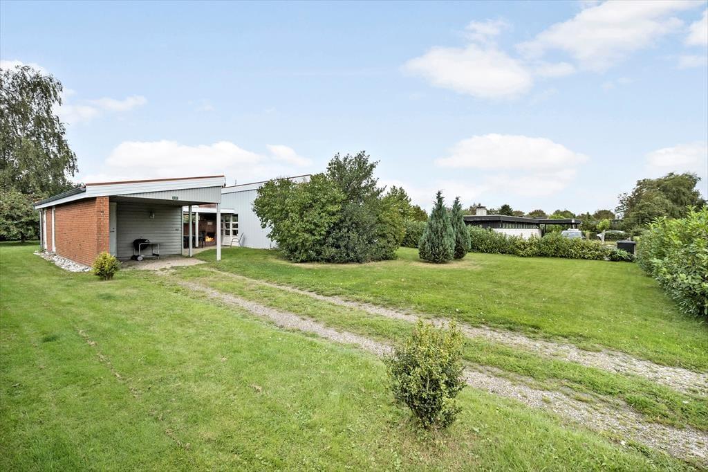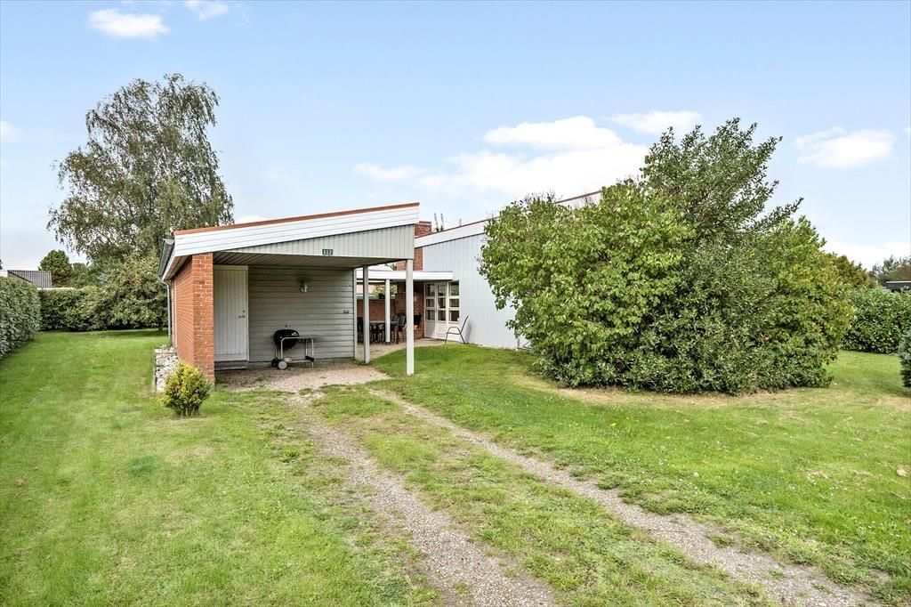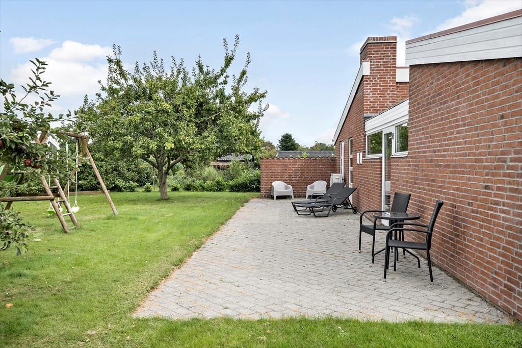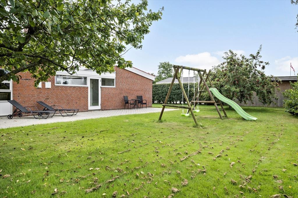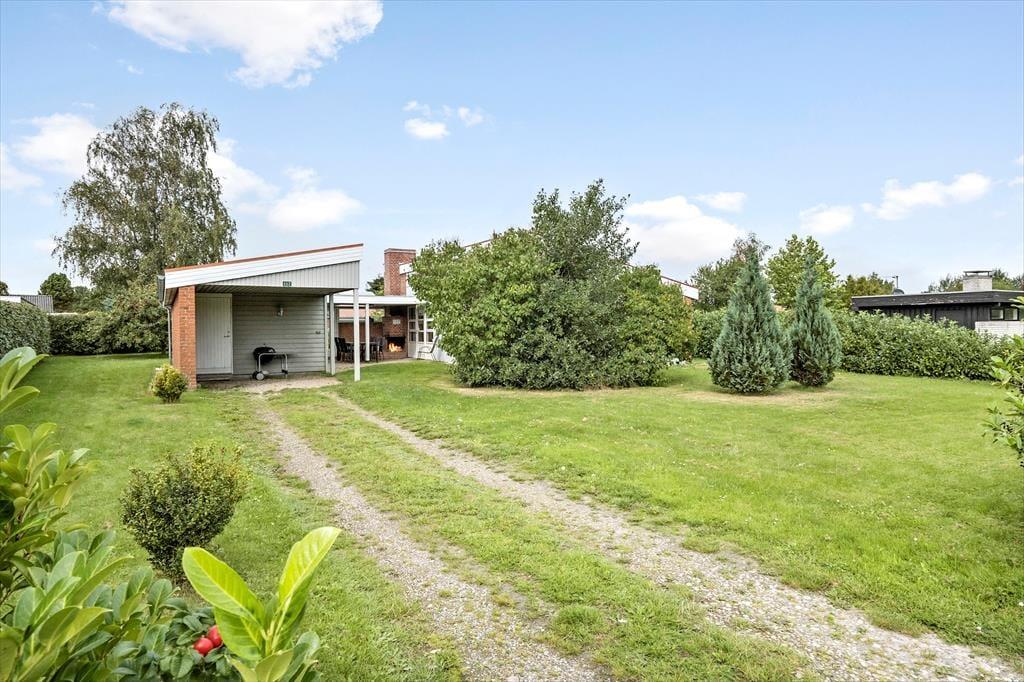 Fritidshuset er beliggende på et lukket vænge med kort afstand til stranden. Foran huset er en stor overdækket og delvist afskærmet terrasse med pejs, havemøbler og liggestole. Derudover er der en god have med gynger til de mindste.
