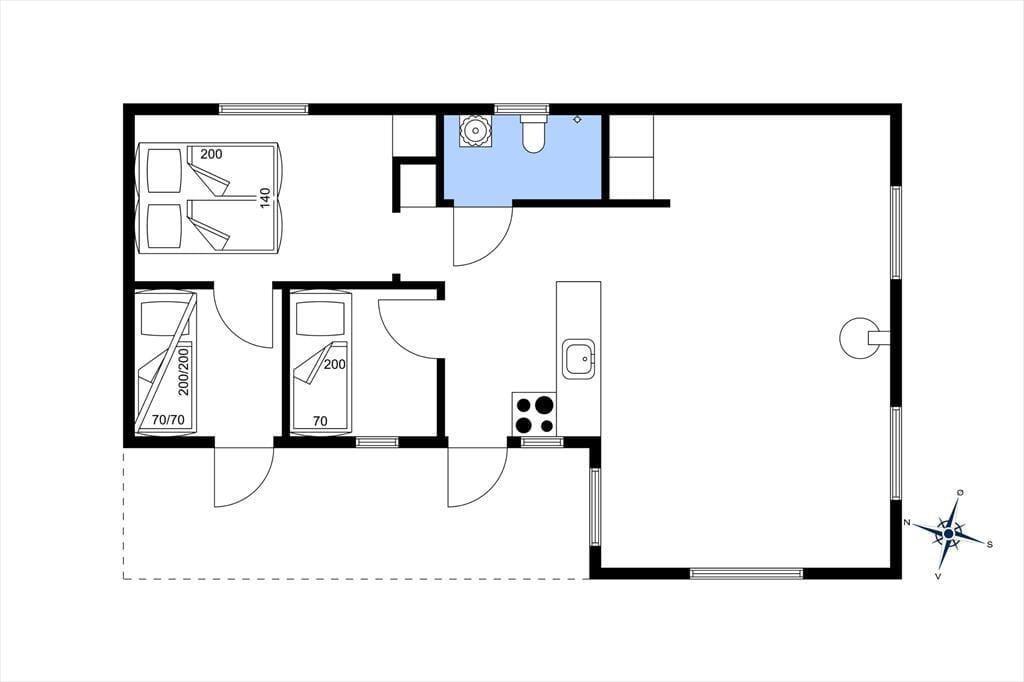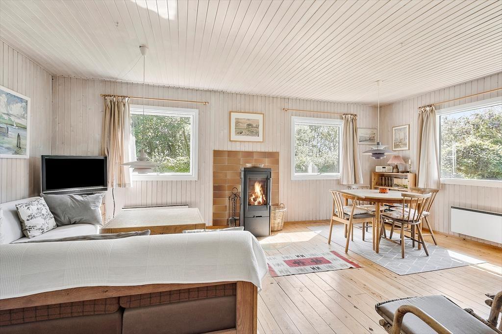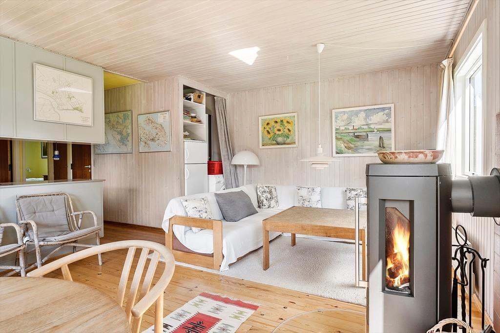 Feriehuset indeholder et køkken i åben forbindelse med stuen, hvor der er brændeovn og udgang til terrassen og haven. Derudover er der et soveværelse med dobbeltseng, et værelse med en køje og et værelse med en enkeltseng. Derudover er der et badeværelse med bruser.