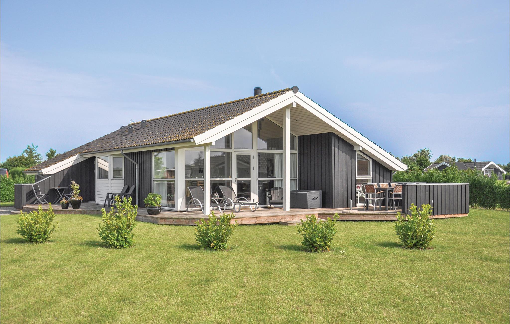 Flot og stilfuldt feriehus i Skovmose med spabad, sauna og stor terrasse tæt på strand og natur.