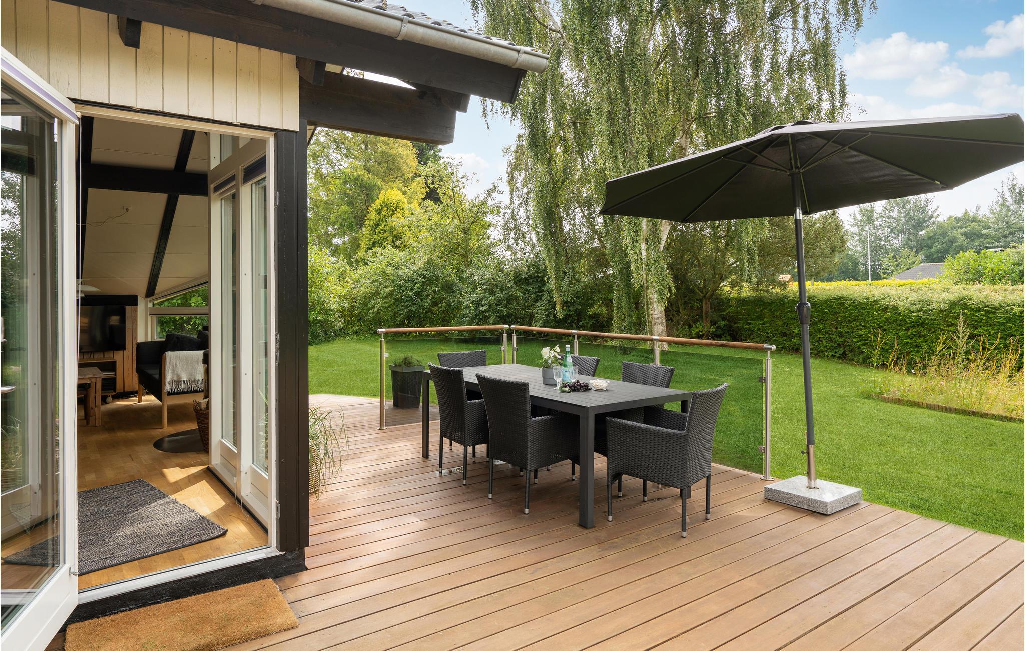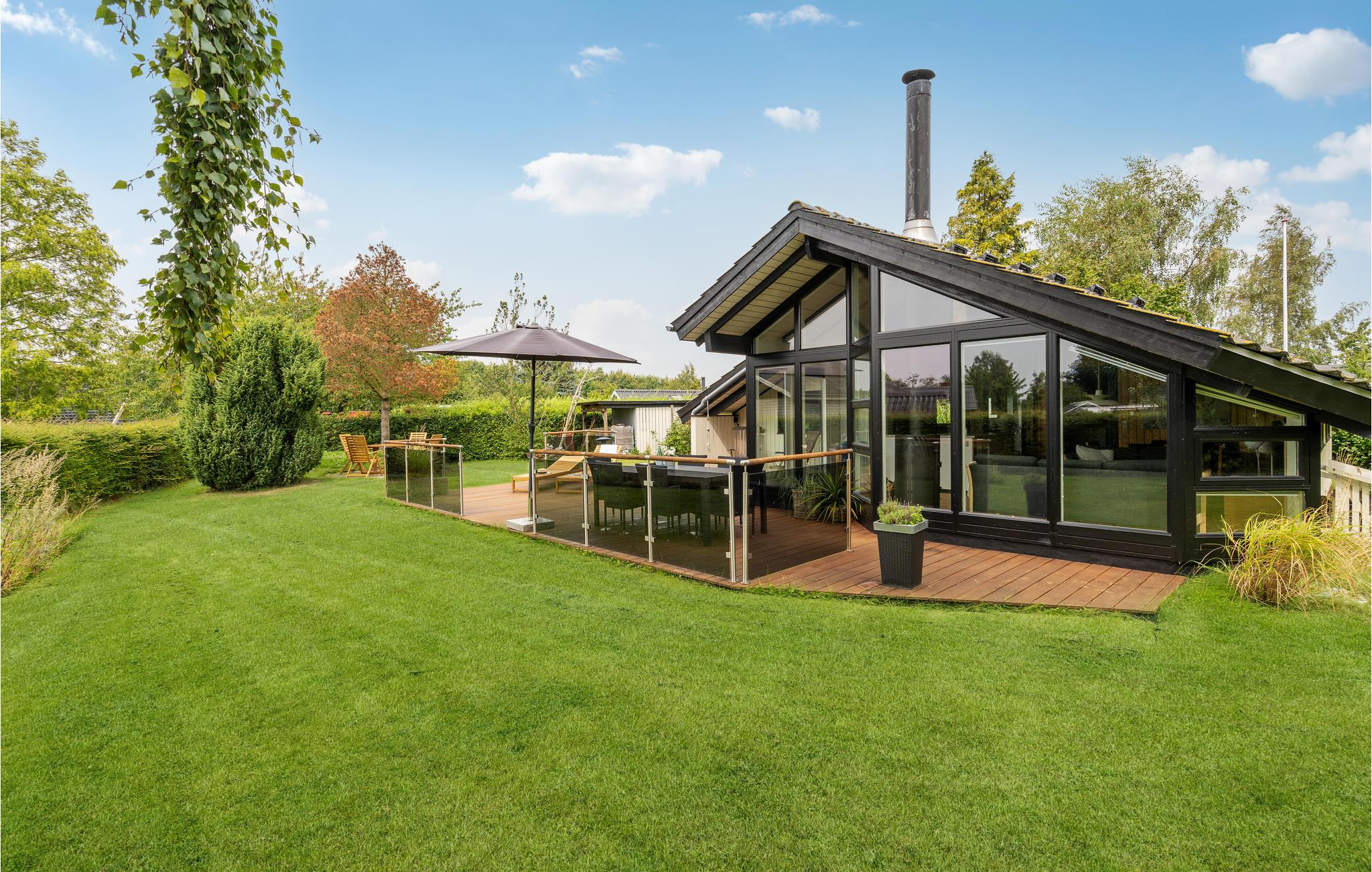 Charmerende sommerhus nær Skovmose Strand med dejlig terrasse og plads til leg i smuk natur.