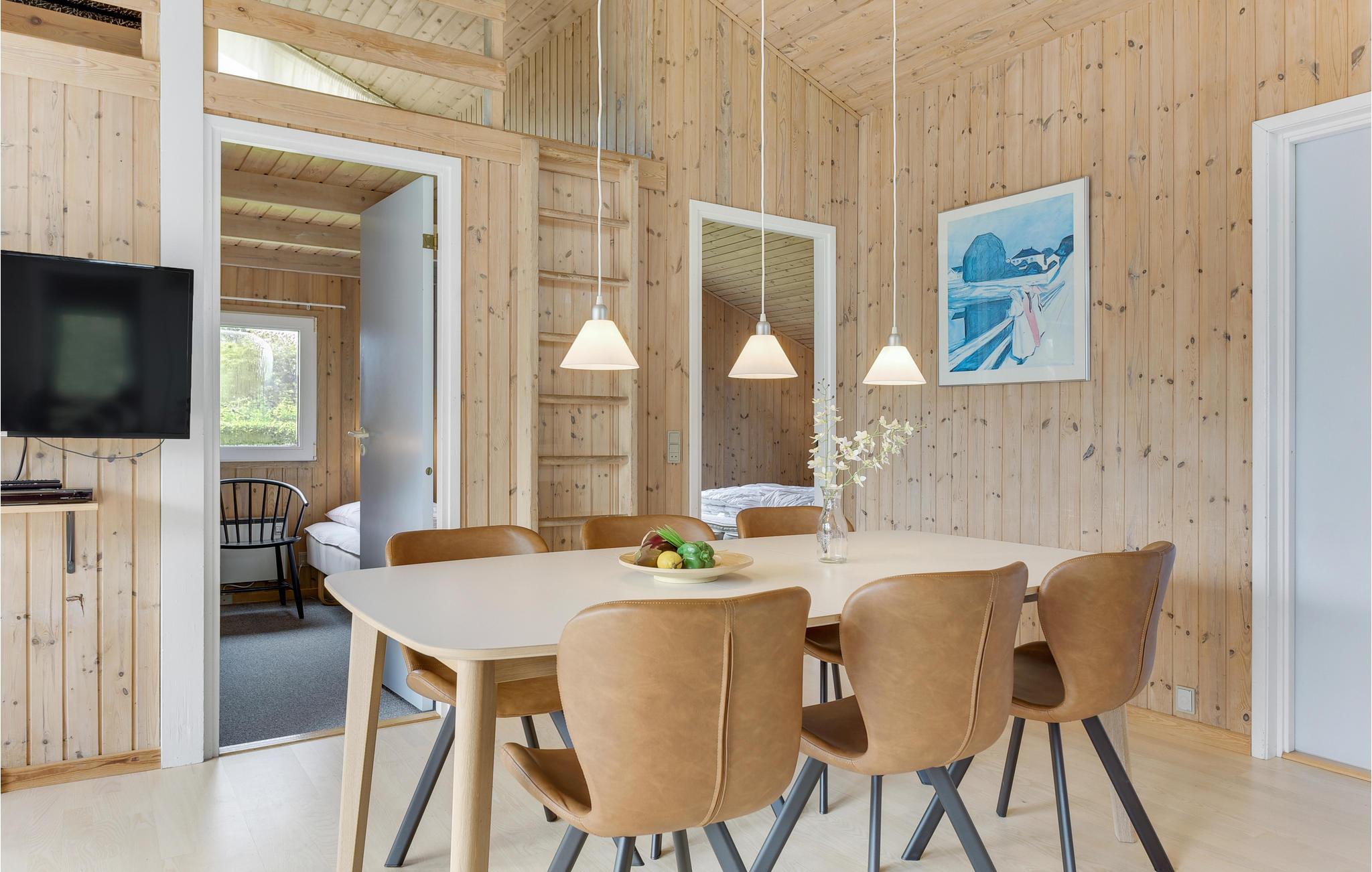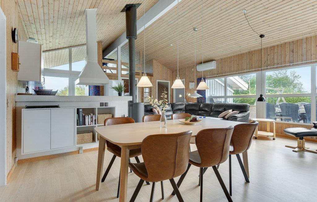 Glæd jer til en afslappende ferie med familien. Feriehuset fremstår yderst hyggeligt med trævægge, og brændeovnen i den lyse stue tilfører en hjemlig atmosfære. Med fire soveværelser og to badeværelser er huset dejligt rummeligt. Efter en lang dag med eventyr kan I slappe af i boblebadet og saunaen.