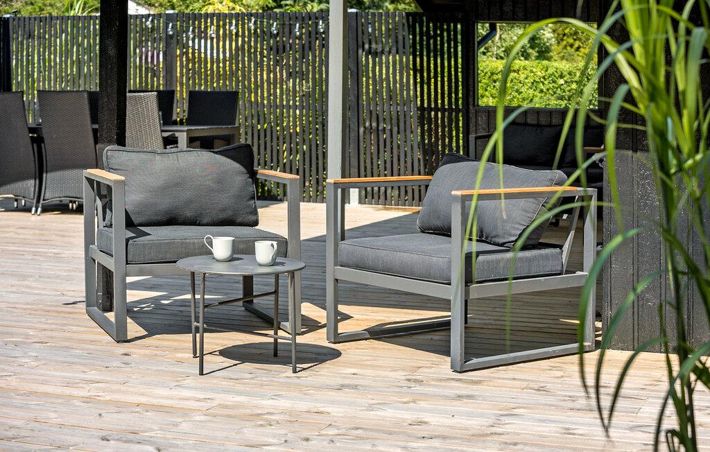 Glæd jer til sommerdagene på den elegante terrasse, hvor man kan sidde ude i al slags vejr. Læn jer tilbage i liggestolene, når solen skinner og dæk op til en herlig sommermiddag med lækre salater og grillretter på det lange bord.
