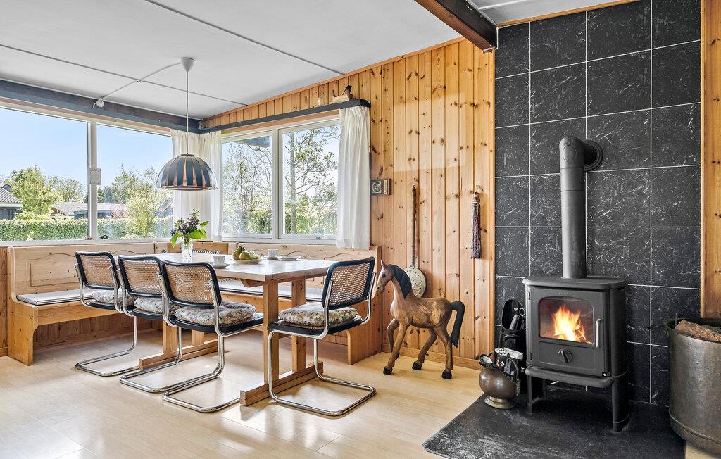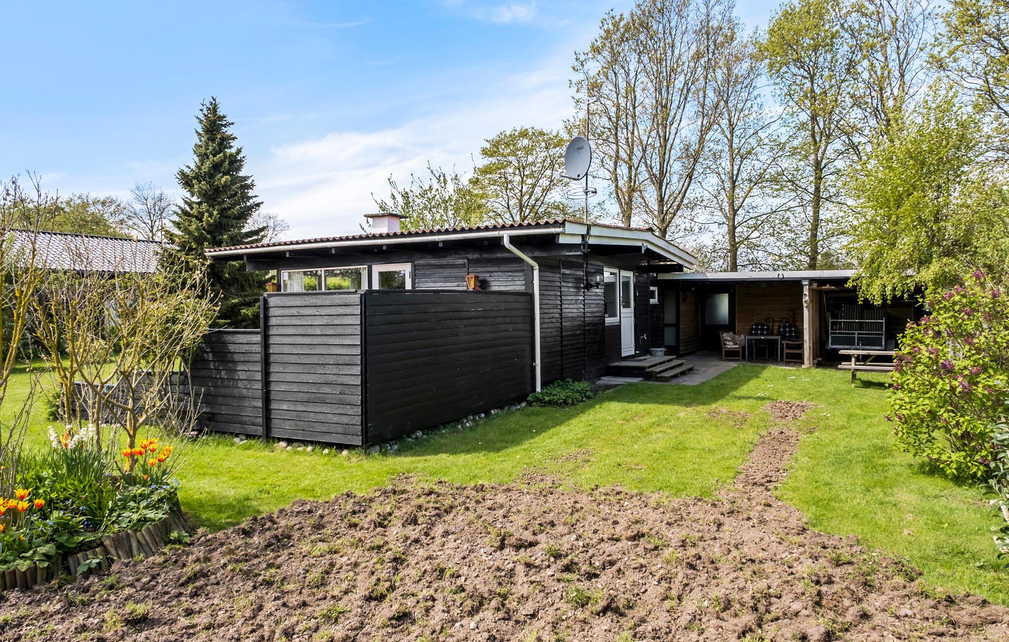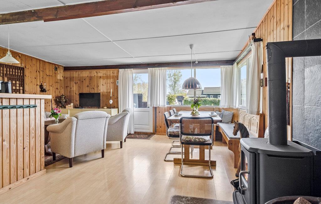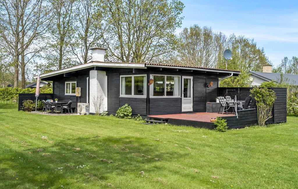 Charmerende træhus tæt på Skovmose Strand med have, brændeovn og moderne faciliteter til en afslappende ferie.