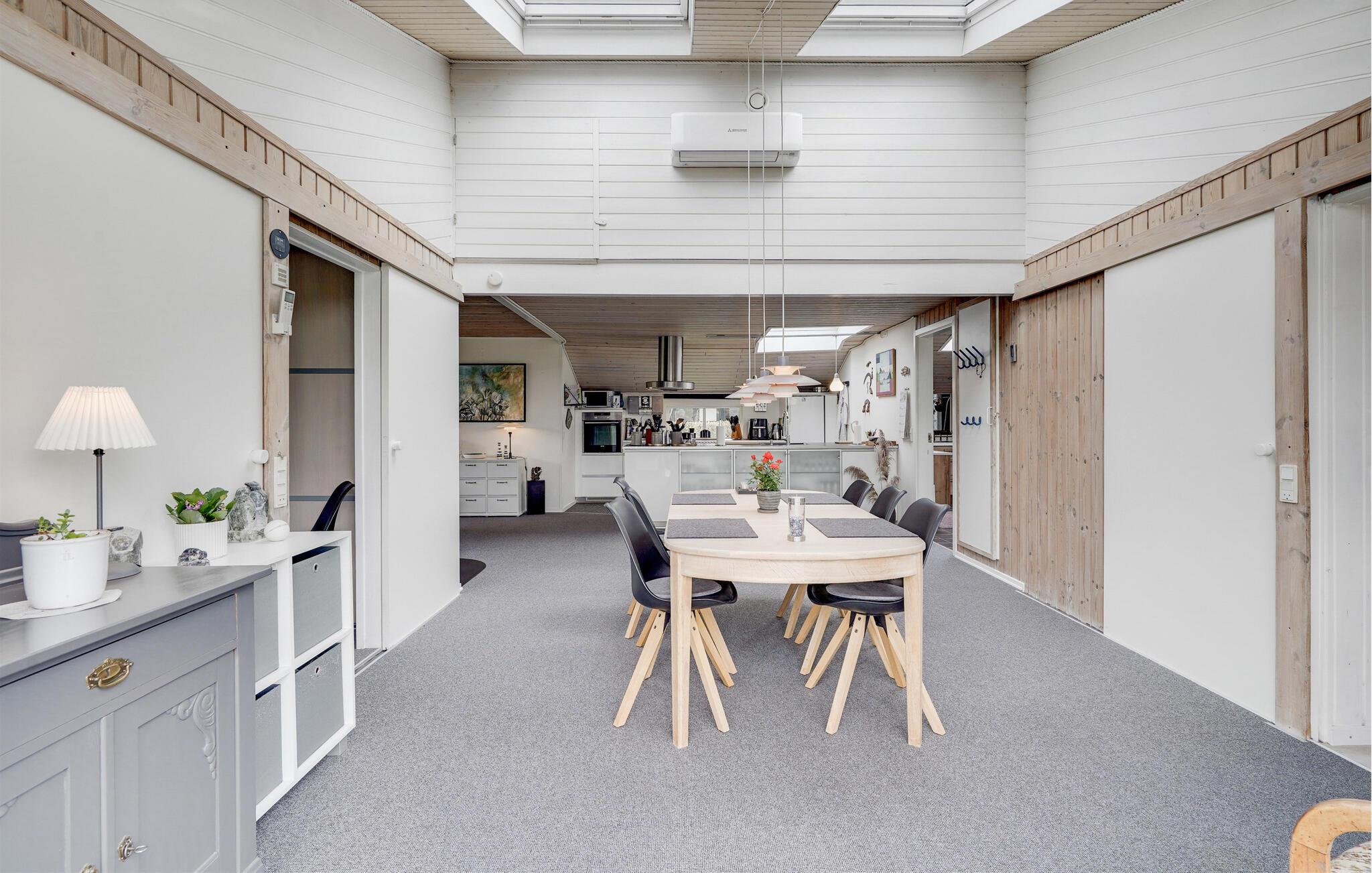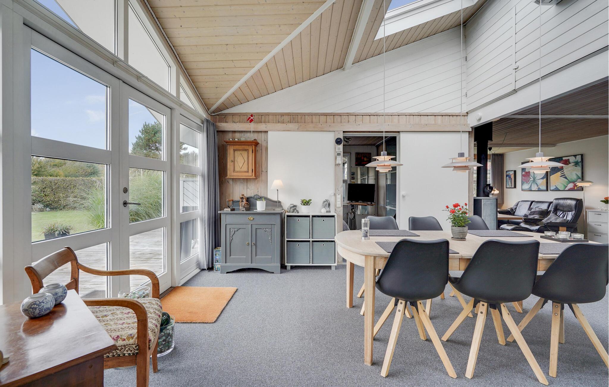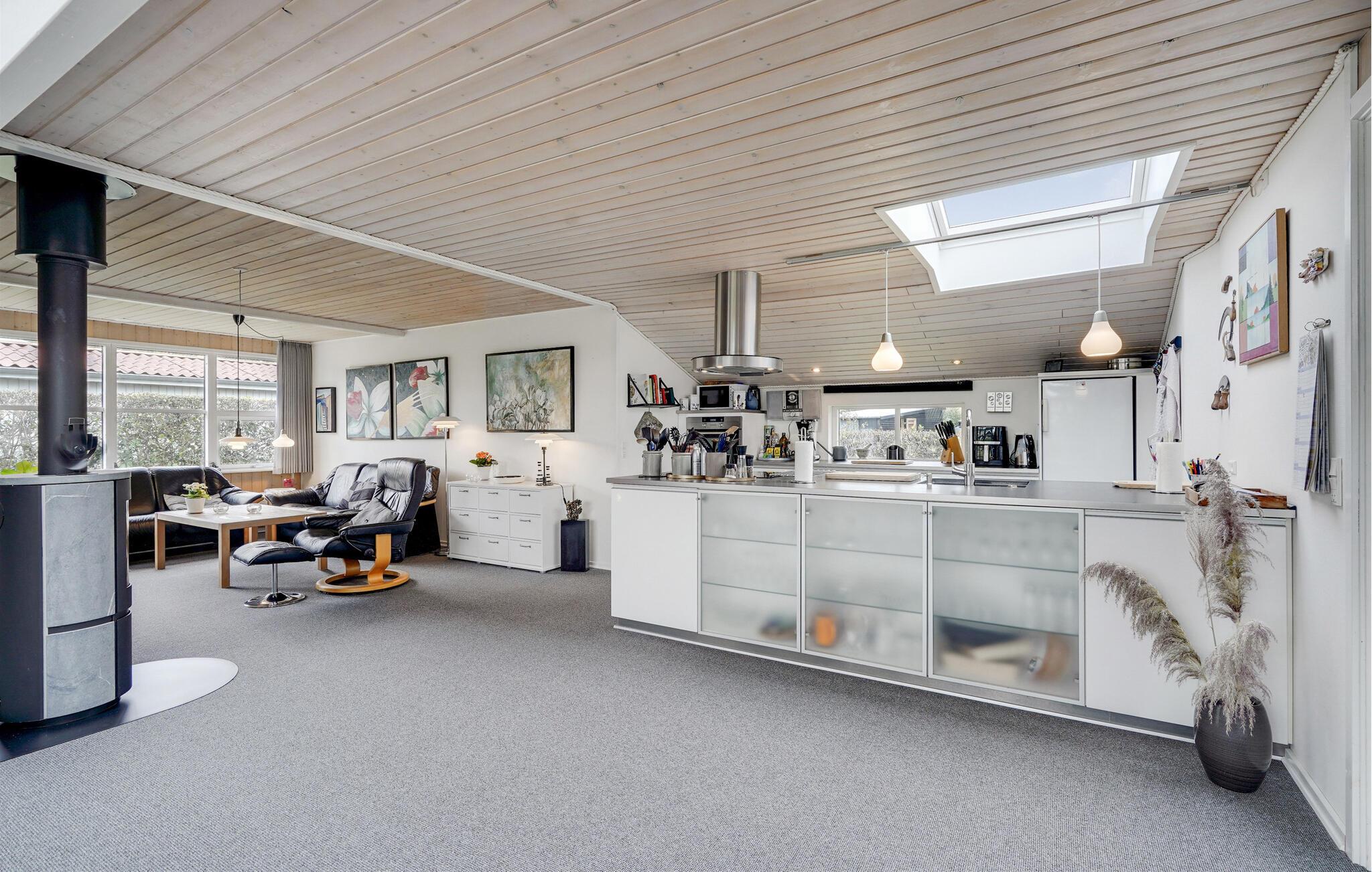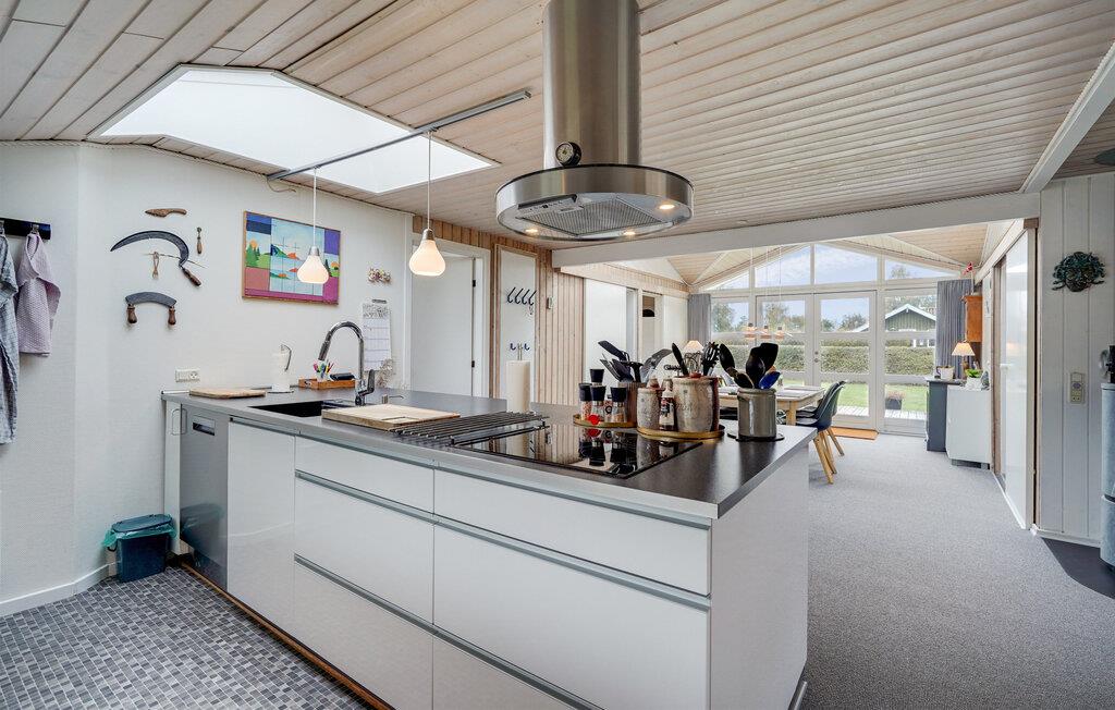 Jeres feriehus er noget særligt med sin lyse, åbne arkitektur, elegante design og fredelige beliggenhed. Store vinduer i opholdsstuen lukker masser af naturligt lys ind og skaber en problemfri forbindelse mellem interiøret og haven. Find jer til rette i sofaerne, mens brændeovnen udstråler behagelig varme. Køkkenet, udstyret med apparater af høj kvalitet og elegante overflader, lægger op til at lave mad sammen. Nyd jeres måltider ved det store spisebord med udsigt over haven og slap derefter af i saunaen.