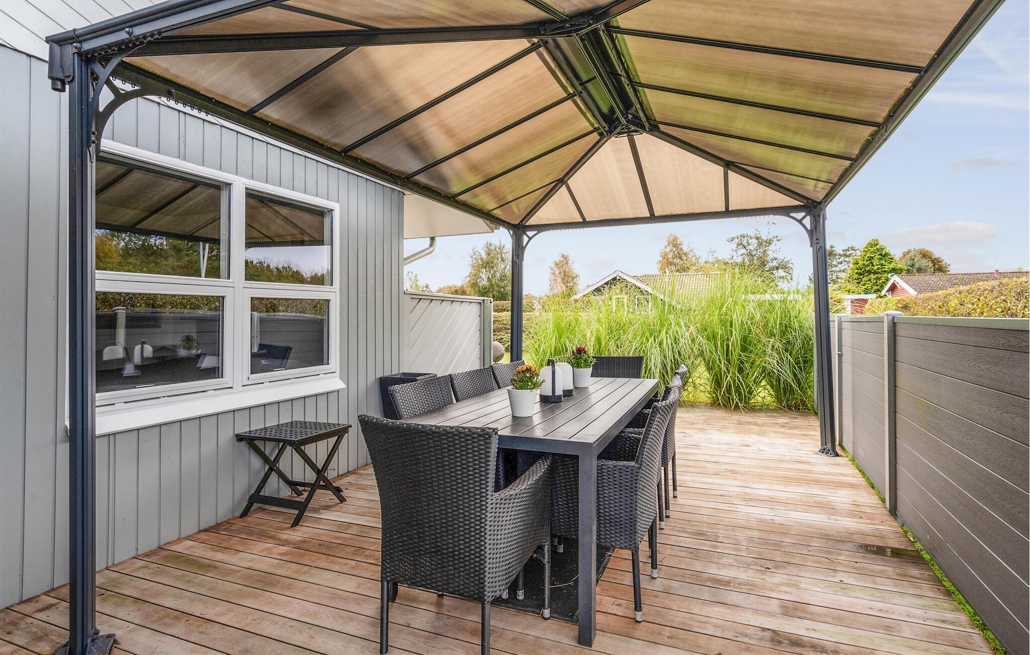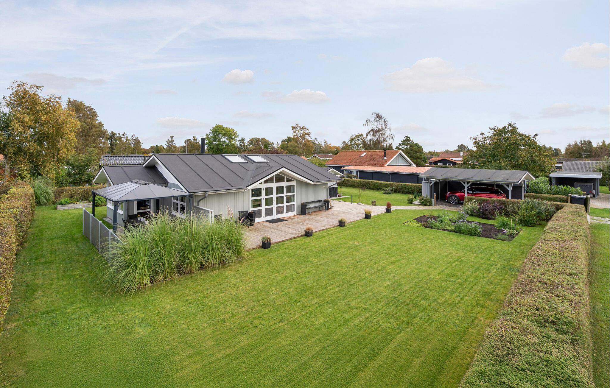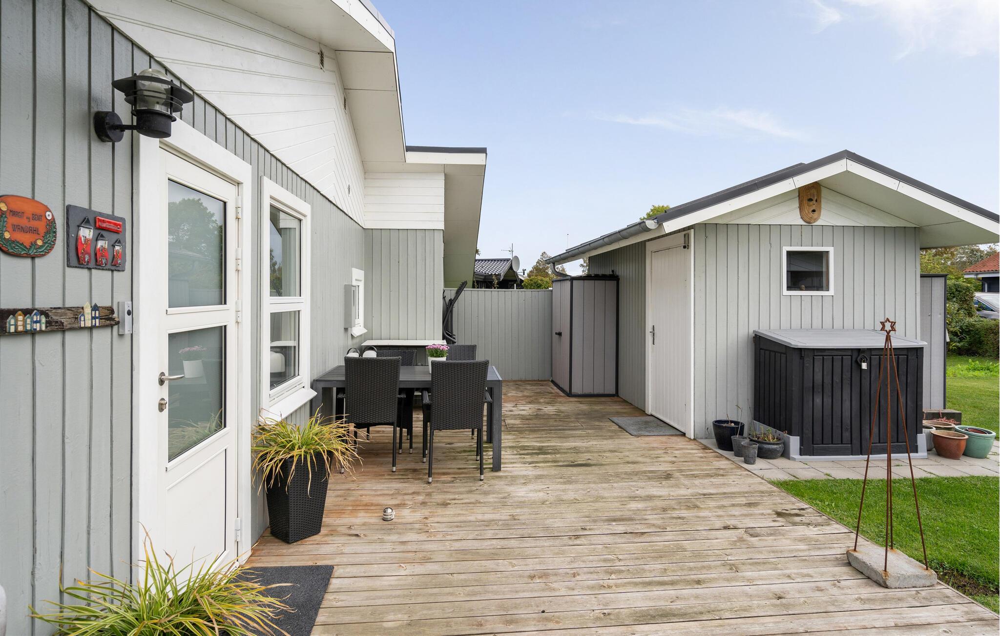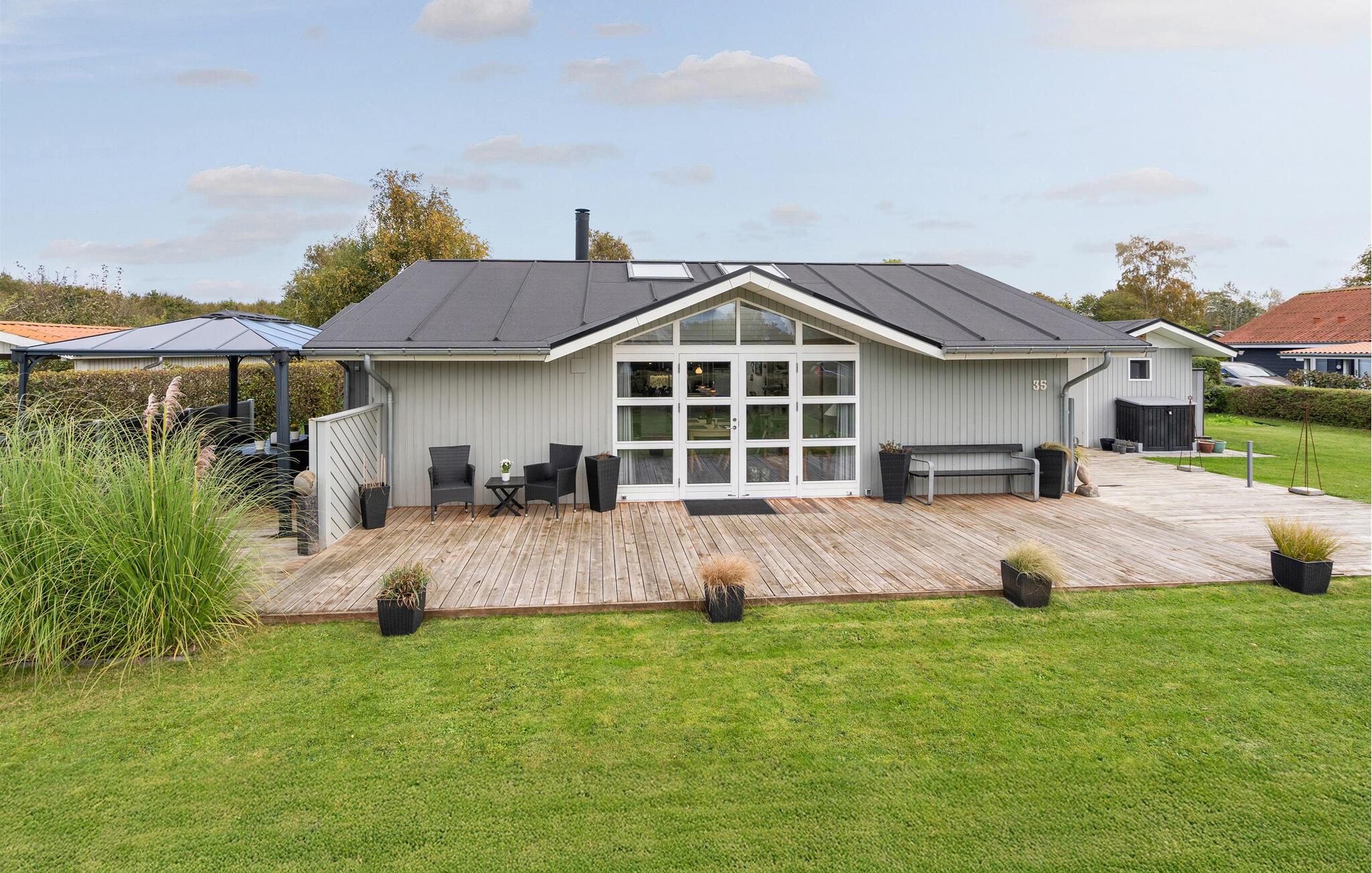 Feriehus med privat sauna og stor terrasse nær Skovmose Strand i rolige omgivelser.