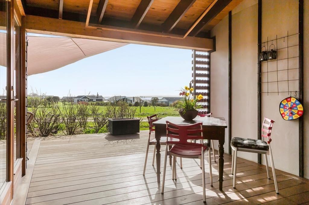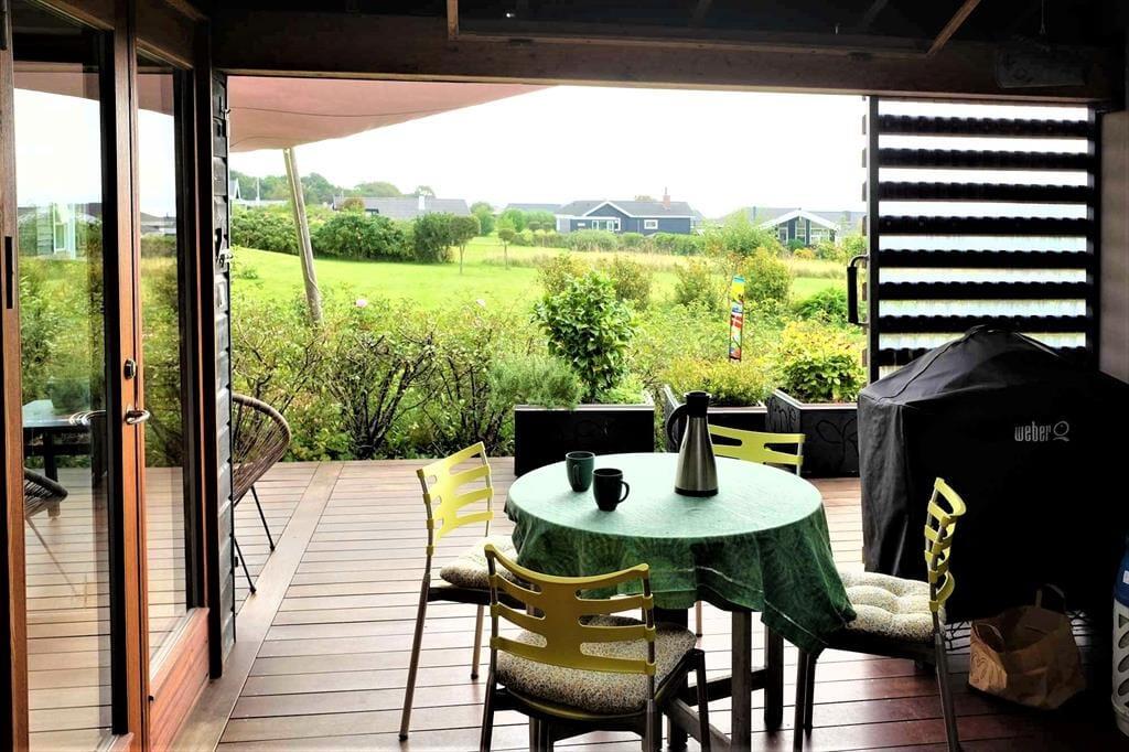 Terrassen er om sommeren uforlignelig. Mellemgangen giver mulighed for at være ude i al slags vejr. Regn, blæst og hedebølge. Med det innovative naturlige ventilationssystem kan der køles om nødvendigt. Huset er velegnet til en lang ferie, hvor der er mulighed for at koncentrere sig om afslapning eller arbejde.