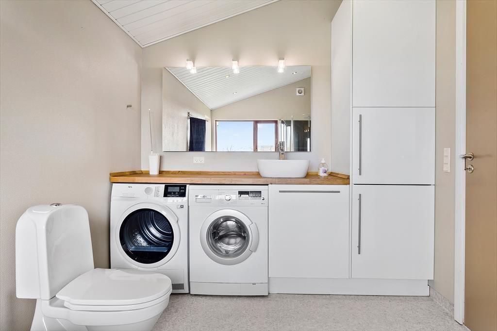 Huset har to toiletter med bruser. Det ene med badekar, vaskemaskine og tørretumbler.