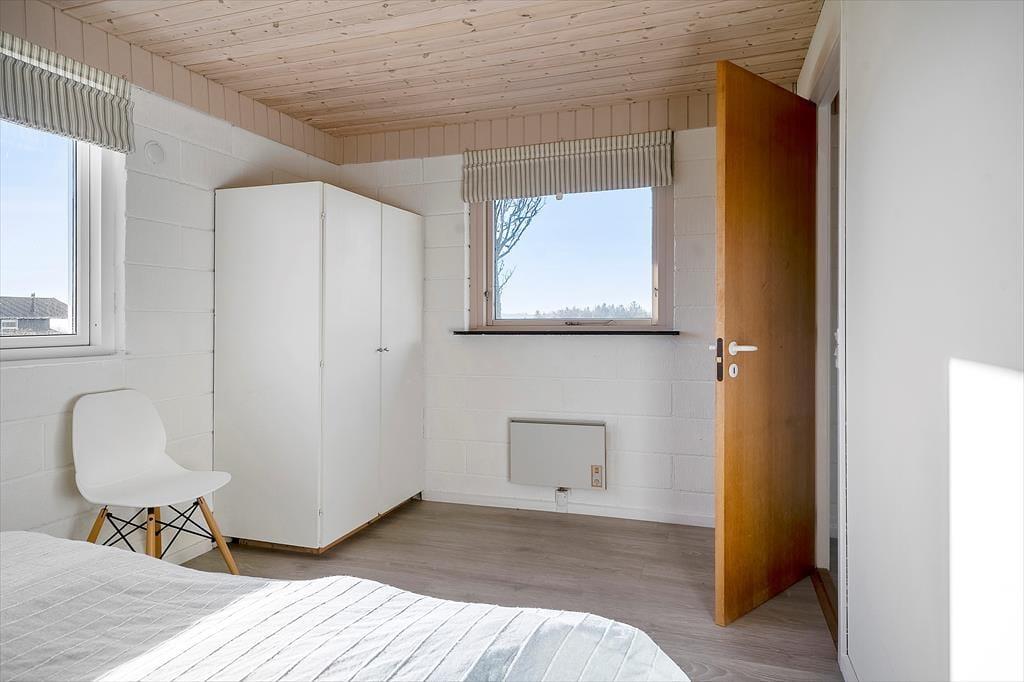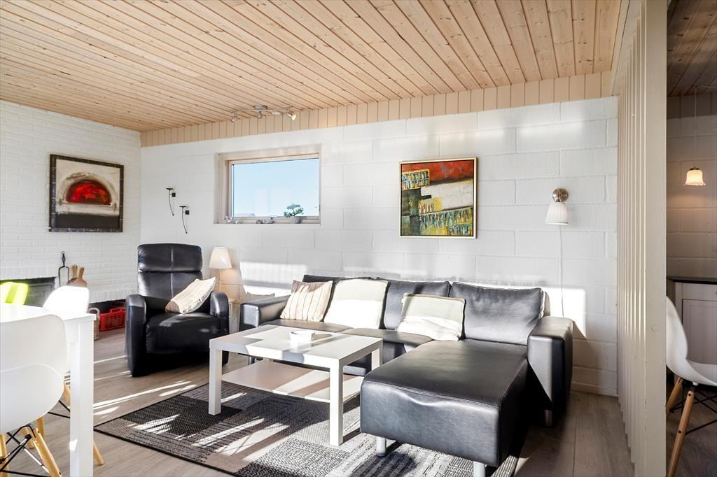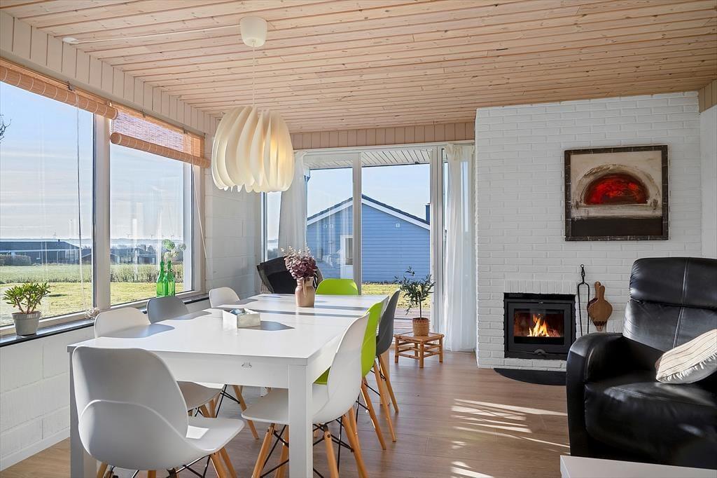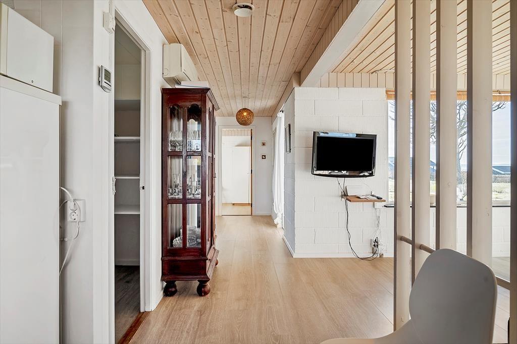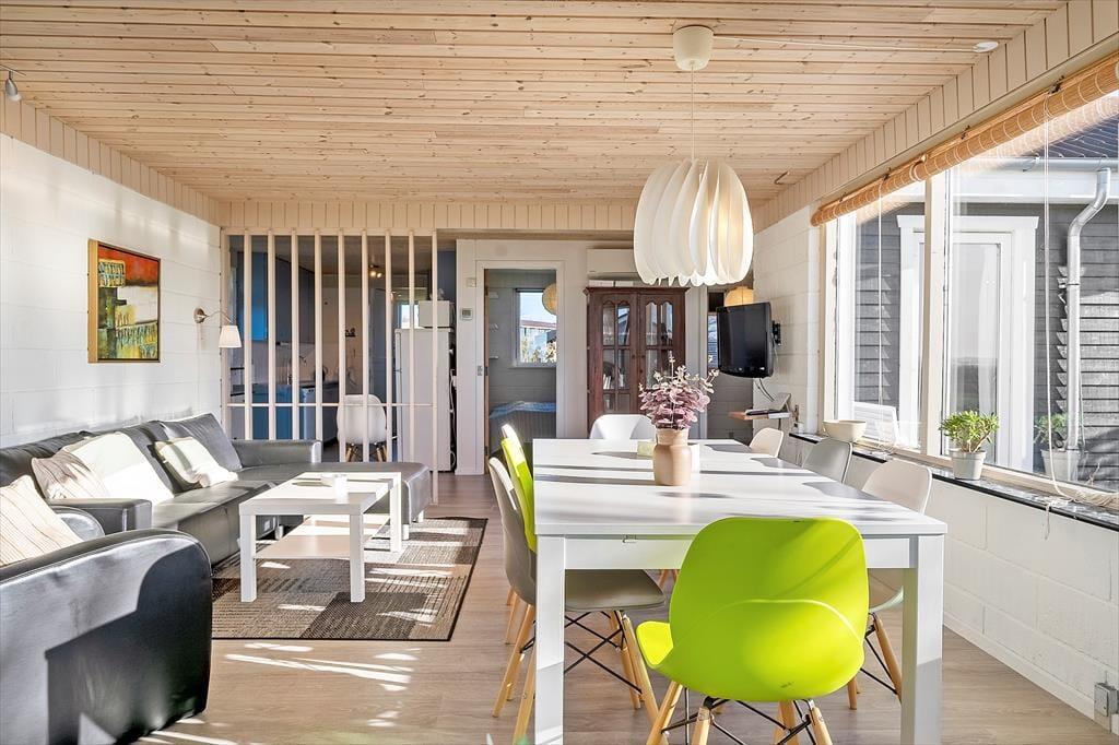 Sommerhuset er med sine 95 m2 ganske stort, så der er god plads til familiehygge og afslapning. Soveværelser er der to af: Begge er indrettet med dobbeltseng, og på det ene er der desuden en køje over, så i alt er der sengepladser til fem personer i huset. Et badeværelse med brus og en entré med vaskemaskine hører også til planløsningen, og endelig er der køkkenet og stuen, hvorfra i har udsigt til Limfjorden gennem stuevinduerne. Tv’et har tilsluttet Chromecast, og så er der både indbygningspejs og varmepumpe med køl, der sørger for en passende temperatur inden døre. En anden dejlig opholdsplads er havestuen, der fungerer som en god overgang mellem huset og det hyggelige terrassemiljø.