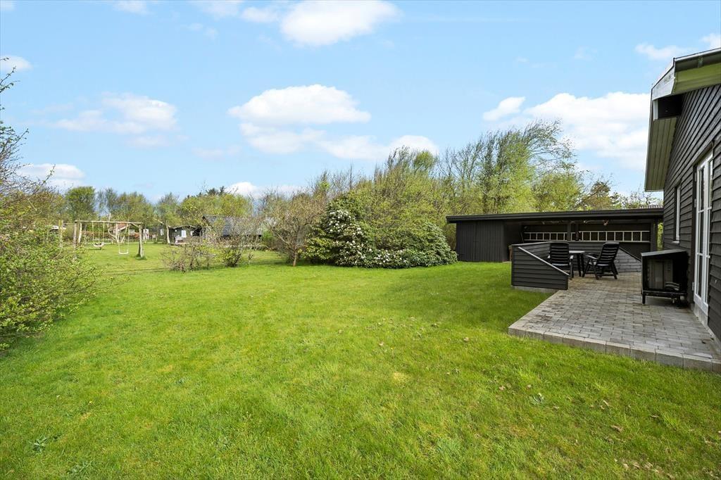 Fra opholdsrummet har I direkte adgang til to skønne fliseterrasser: Den sydøstvendte er delvist overdækket, og på vestsiden af sommerhuset ligger et helt åbent opholdsareal. Ligesom sommerhuset er grundens græsplæne nyanlagt, men randbeplantningen er af ældre dato, så den skærmer haven godt af.