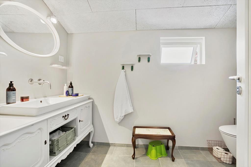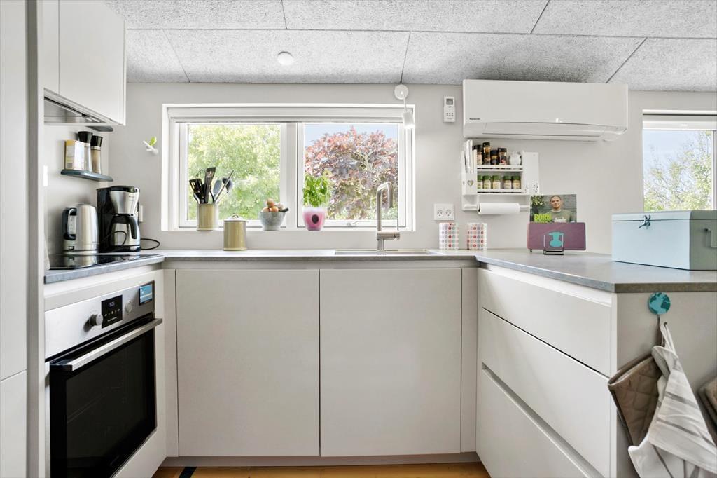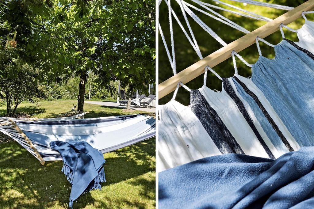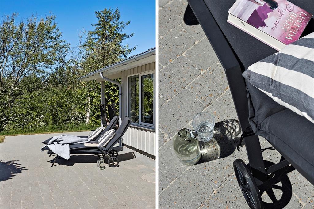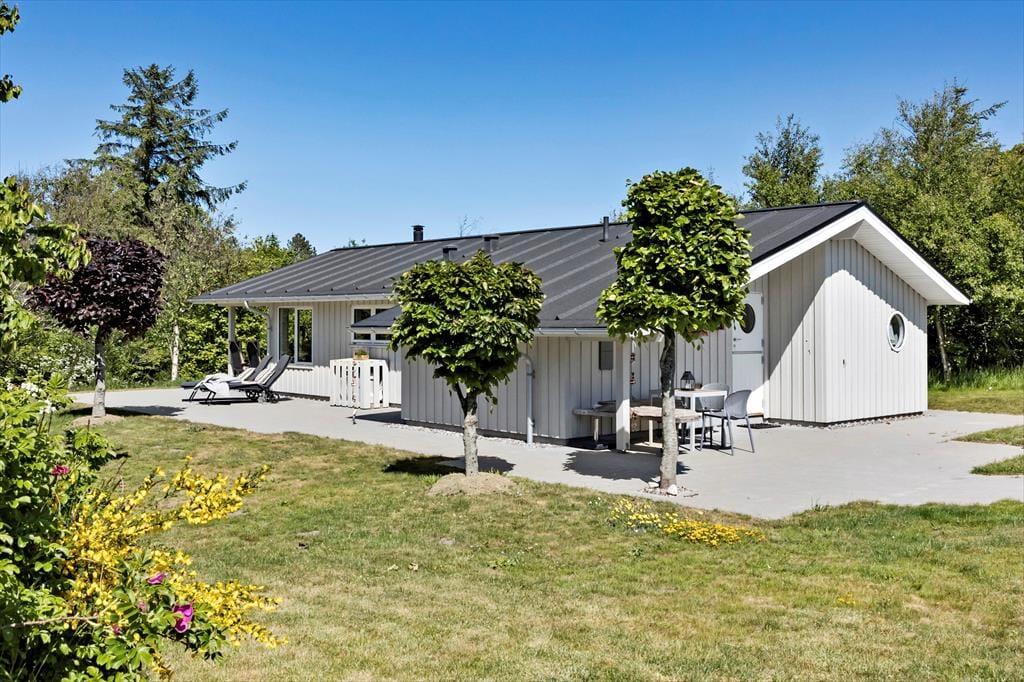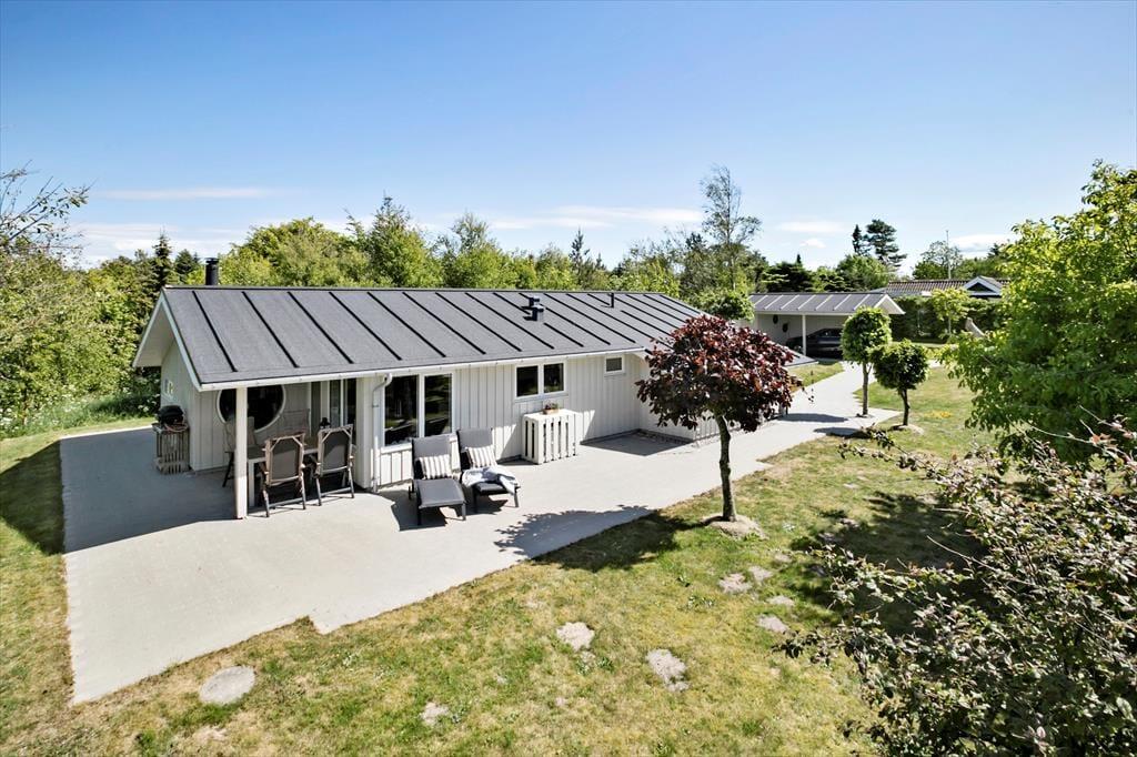 Da sommerhuset blev bygget i 2019, valgte man at bevare den gamle have, så lægivende træer og hybenbuske rammer græsplænen smukt ind. På en solrig sommerdag er der mulighed for at tage en pause i skyggen, inden I går i gang med at grille på terrassen, og hvis der skal være mere gang i den, kan I smutte ud på de grønne fællesarealer for at spille bold. På grunden er der carport til bilen, og der er også et skur, hvis I har medbragt cykler – der er endda cykelophæng, og ude foran er der skylleplads til jeres udstyr.