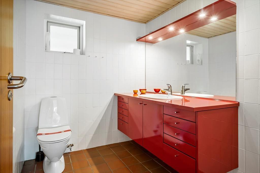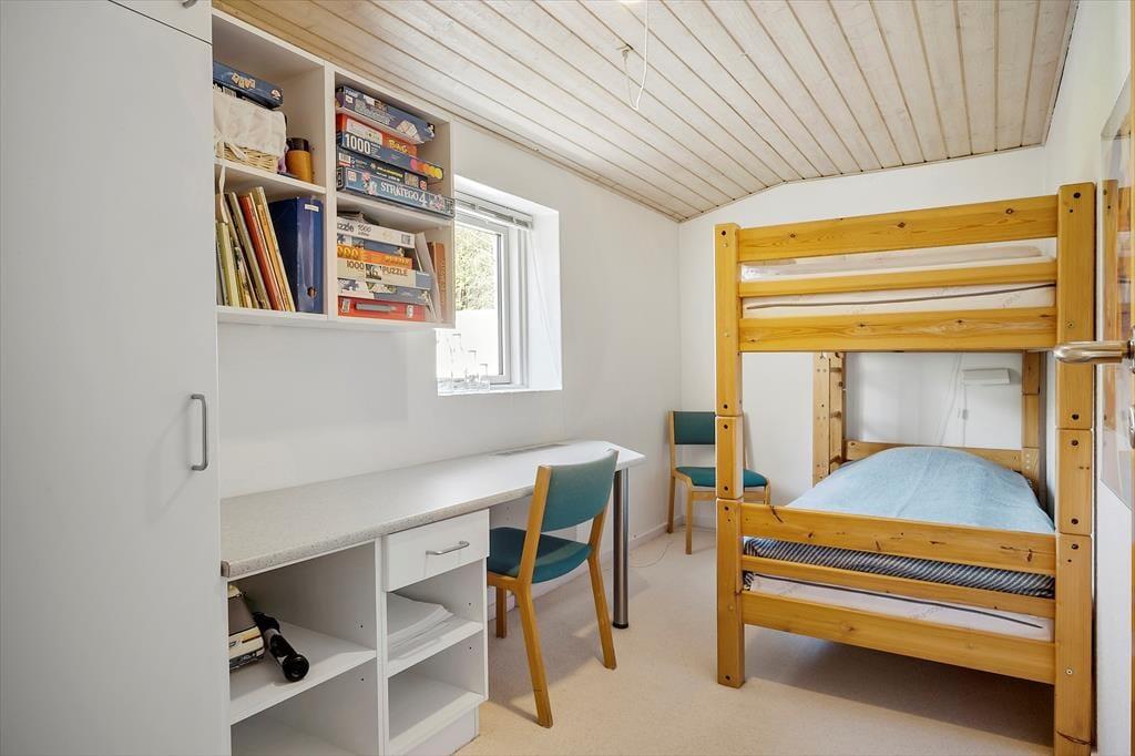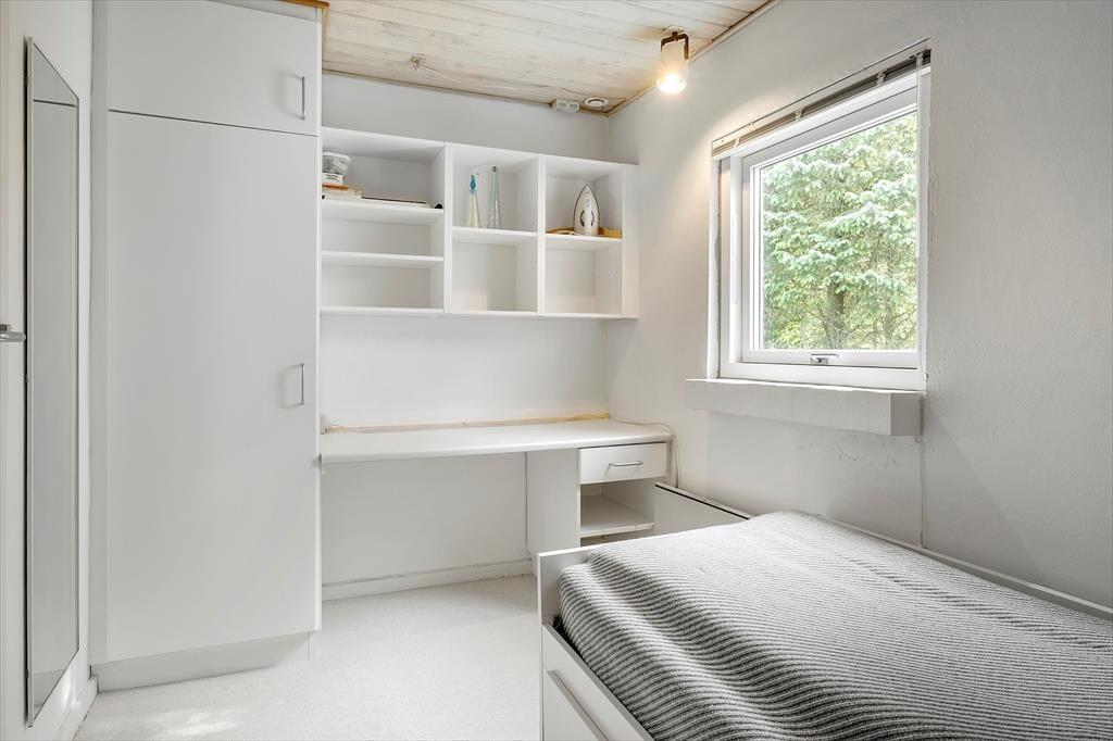 Sommerhuset har en spændende 1960’er-arkitektur med tag med ensidig hældning og vinduer i forskellige formater. Det har også betydning for rumfornemmelsen inden døre, for den gode loftshøjde, det gennemstrømmende lysindfald og de høje vinduer skaber en indbydende atmosfære. I det store opholdsrum, hvor spisekøkken og stue er forenet, er der installeret gulvvarme, og på de kølige aftner kan I tilmed tænde op i brændeovnen, når I hygger jer i sofaafdelingen. Udover opholdsrummet består planløsningen af et badeværelse, et praktisk bryggers og fire gode soveværelser med i alt syv sengepladser.
