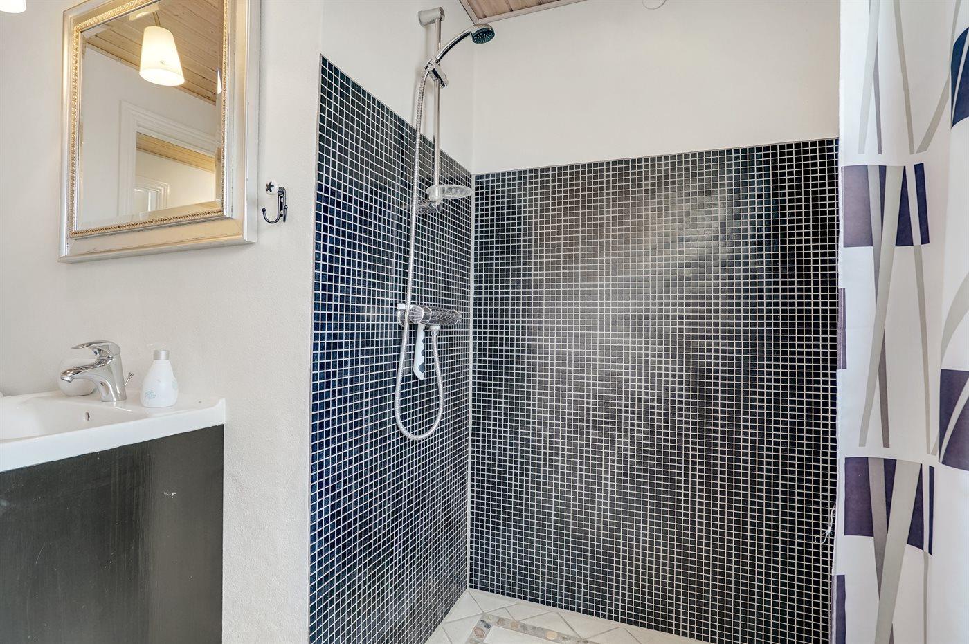 Der er 2 badeværelser med bruseniche og 2 toiletter. Der er gulvvarme på 2 badeværelser. I saunaen er der mulighed for afslapning.