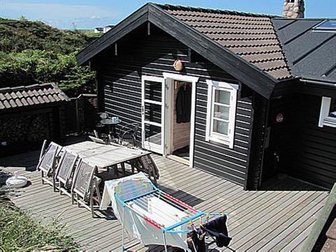 Dette sommerhus er perfekt placeret i mellem klitter og marehalm. Huset ligger på en klit, hvilket betyder at man har en skøn havudsigt fra vinduerne i stuen samt fra terrassen, som er på tre sider af huset. Ude på den store terrasse er der flere forskellige steder, hvor man kan sidde og nyde naturens mange skønne lyde og en god kop kaffe sammen med dem man har kært. Indgangen til sommerhuset er på den sydvendte terrasse, hvor man her har en solgryde. Her er der plads til at man kan solbade eller spille spil med familien, uden nogle afbrydelser fra omverden. Dette er et rigtig hyggeligt sted, hvor der også er læ for vinden. Som et ekstra plus har dette hus et udendørsbrusebad, hvilket er skønt at anvende efter en tur på stranden for at bade eller blot efter en varm dag på terrassen.