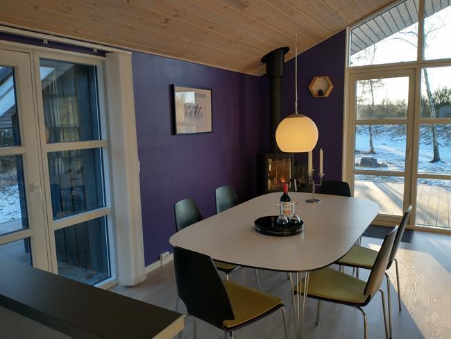 Som et ekstra plus i dette skønne sommerhus med de store vinduer, den fine indretning og den spændende dekorativt brugskunst, er her også en brændeovn, for at skabe den helt rigtige sommerhusstemning.