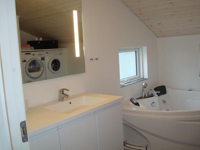 Selve huset er stort og rigtig indbydende at træde ind i. Her mødes man af en entre, hvor loftet går i kip. I denne lyse entre er her to døre på hver side. På højrehånd mødes man af husets to ud af tre værelser, hvor alle har en dobbeltseng. På venstrehånd mødes man af to lækre badeværelser, begge med brusebad, men den ene har den ekstra luksus, at have spabad. Hvilket er helt ideelt at bruge, til at slappe fuldstændig af i, med et glas champagne i hånden og stearinlys i vindueskarmene. Ingen bedre måde at koble af fra hverdagen på.
