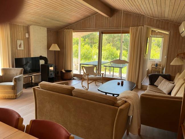 Den tidligere nævnte stue har både en afdeling med spisebord, samt to lækre sofaer, hvorfra man kan nyde naturen ud af de store vinduer, se tv eller nyde varmen og ilden i den smukke og unikke brændeovn.