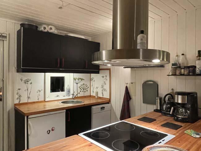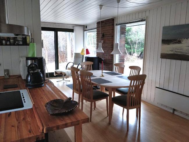 Dette sommerhus har en speciel varme og sjæl med sine hvidmalede brædder på vægge og loft. Fra hoveddøren træder man direkte ind i køkkenet, som lægger op til en masse gode timer med familien omkring madlavningen. På den anden side af halvvæggen, som separerer køkkenet og stuen fra hinanden, er her en masse familiebrætspil. Disse spil kan man frit tage frem og underholde hele familien med ved det fine spisebord eller ved sofagruppen, med det antikke kakkelbord. Fra de bløde sofaer er det også muligt at se en god film med familien i tv'et eller at nyde varmen fra den store brændeovn.