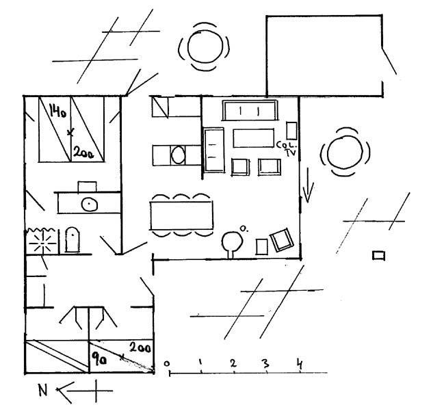 Dette er et sødt lille grønt sommerhus med en masse charme, midt imellem en masse træer og klitter. Dette er en perfekt beliggenhed tæt på både strand og skov, og så alligevel væk fra trafikstøjen. Her er det blot fuglekvidder og græshopper, man kan høre. Huset har to terrasser, den ene ved hoveddøren, hvor man kan nyde strålerne fra morgensolen, og den anden er stor og er både på både syd og vest siden af huset. Siden mod syd, er desuden overdækket, så man kan nyde de varme sommeraftener, selv i regnvejr. På en varm sommerdag er disse terrasser perfekte for hele familien at tilbringe nogle kvalitetstimer sammen på. Huset har døre direkte ud til terrasserne.