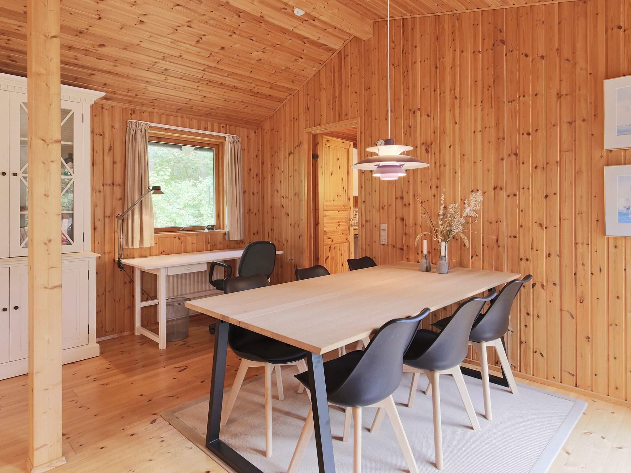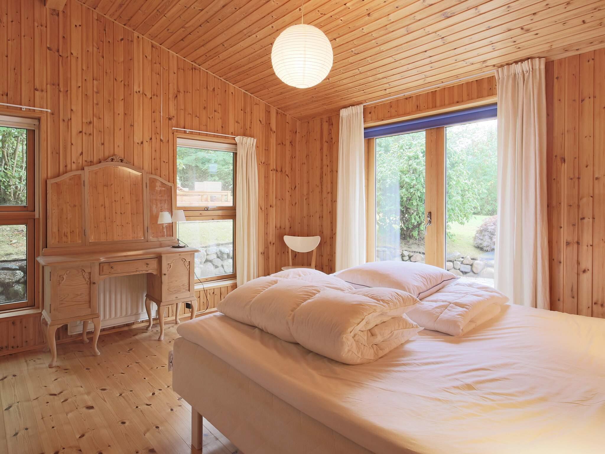 Sommerhus beliggende for enden af lukket vej med direkte adgang til stisystem der bl.a. fører til stranden. Via entreen er der adgang til værelse og husets ene badeværelse. Herfra kommer I ind i køkken/alrum/stue, som er et stort vinkelrum med rigtig god plads. Der er spiseplads og rummeligt køkken med alle faciliteter. Stue med sofaer og tv, hvorfra der er adgang til husets andet værelse. I huset er der 2 dyner, der er 220 cm. Fra køkken/alrum er der en mindre gang til forældreafdelingen, som består af badeværelse og stort lyst soveværelse med direkte adgang til haven. Omkring huset er der flere terrasser og en stor, lukket have. Udlejes ikke til ungdomsgrupper.