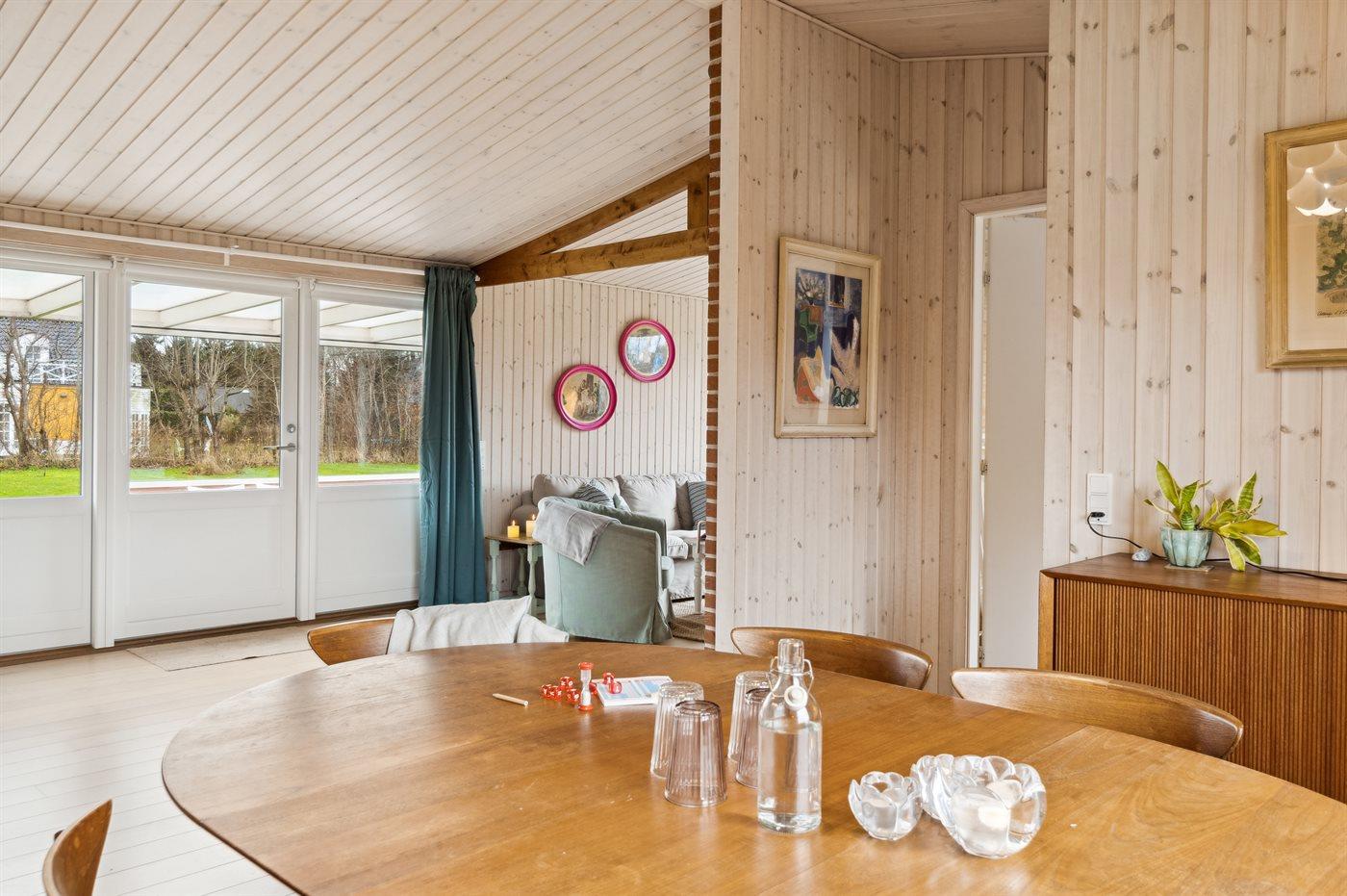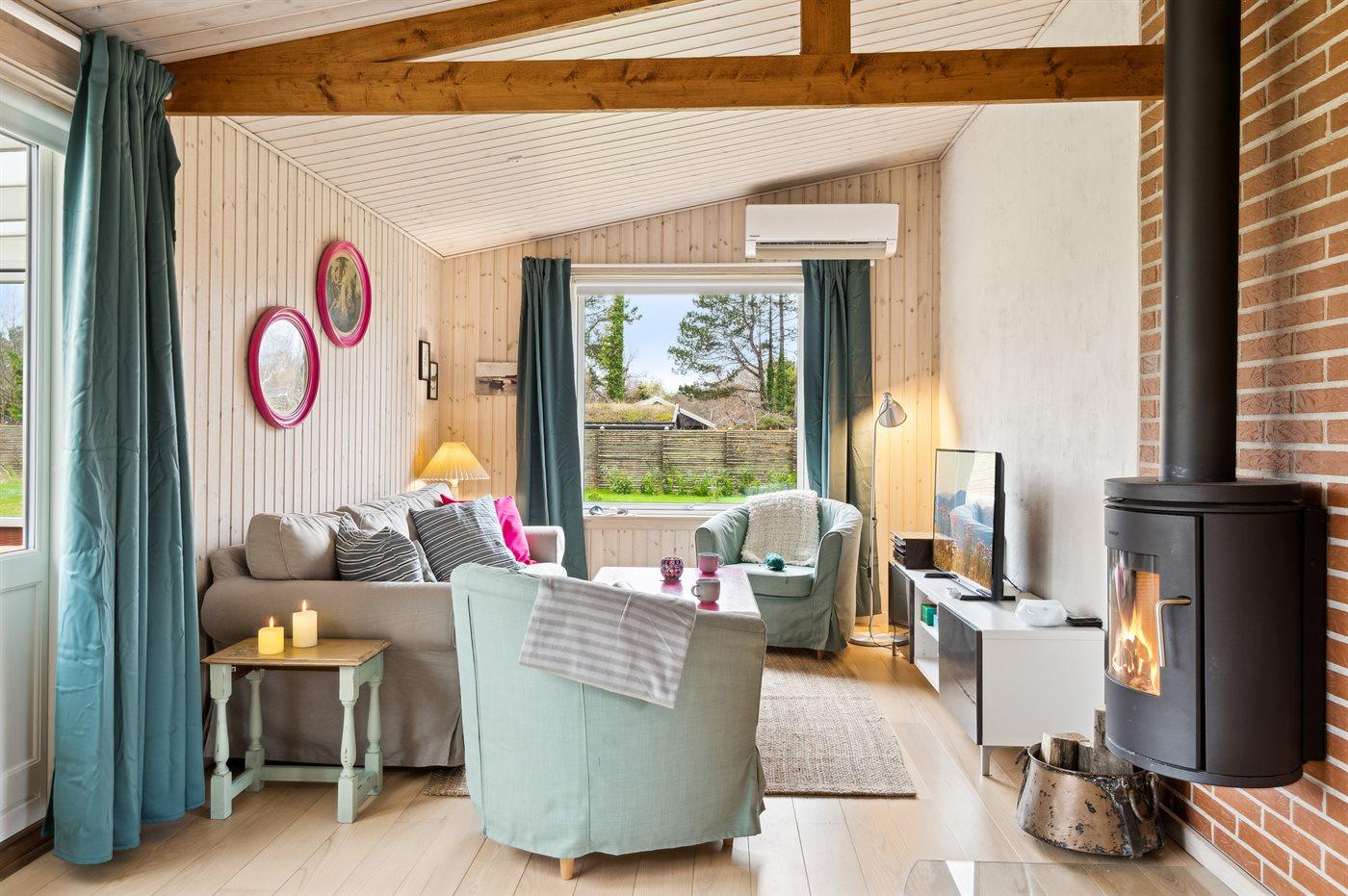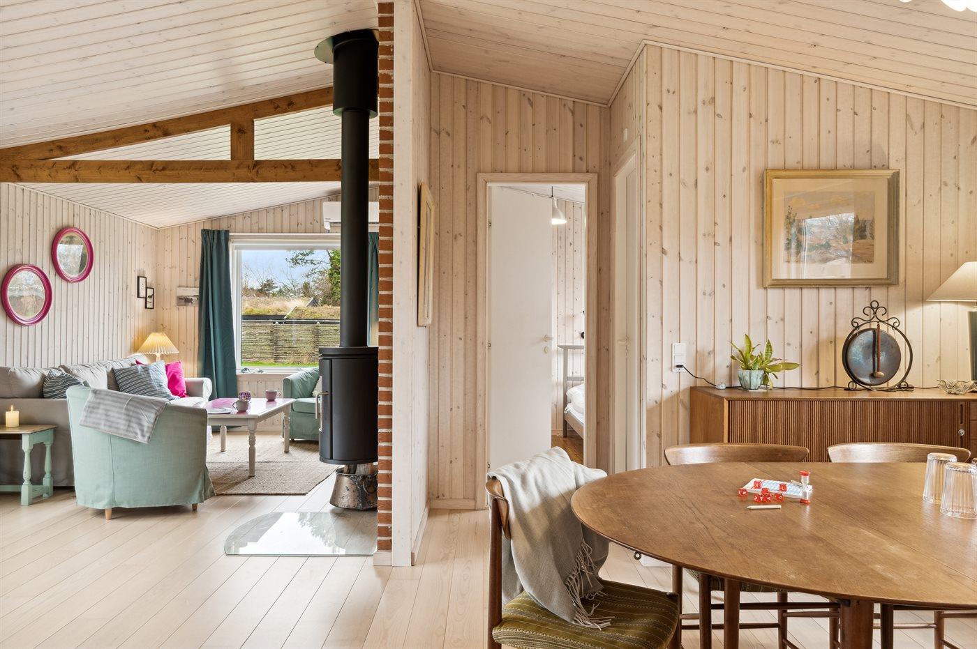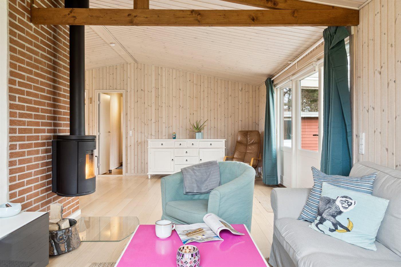 Nyd ferien i et godt beliggende sommerhus. Huset har stue med brændeovn, spisestue og udgang til stor overdækket terrasse. Der er tre soveværelser – et med dobbeltseng og to med enkeltsenge - samt et badeværelse og et gæstetoilet. Her er desuden masser af muligheder for leg, afslapning og madlavning udendørs.
