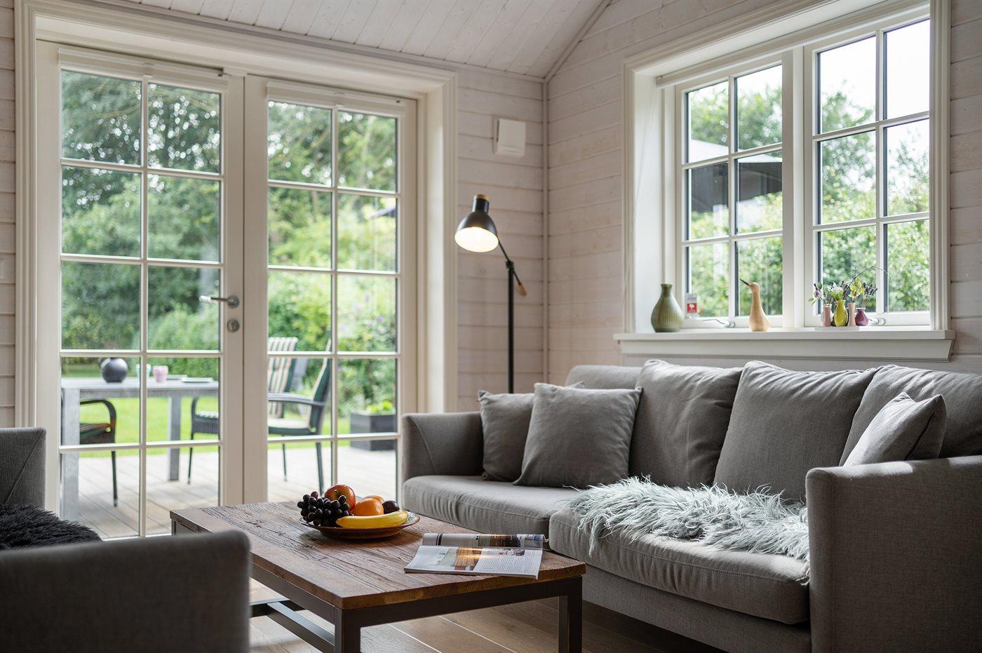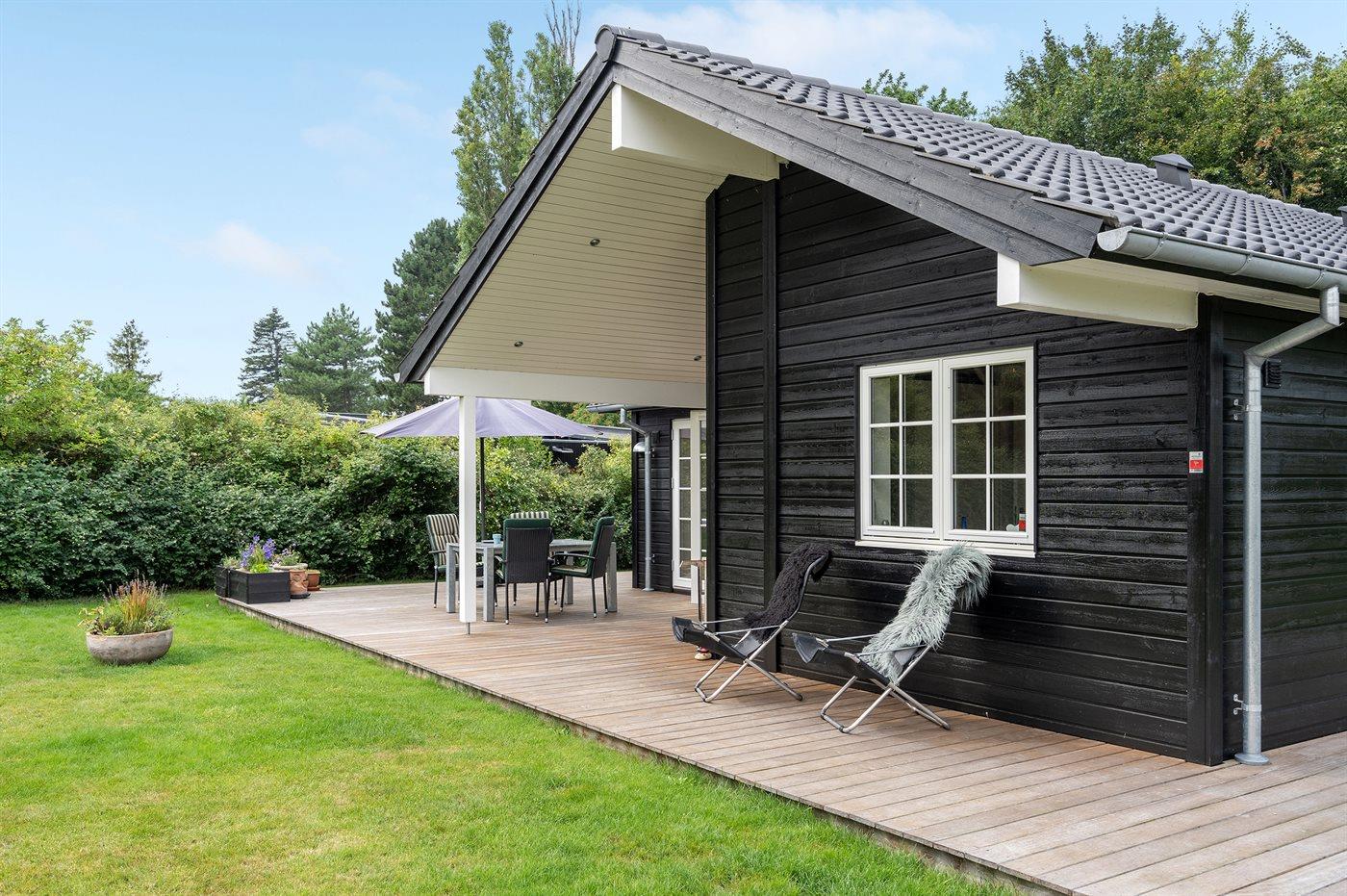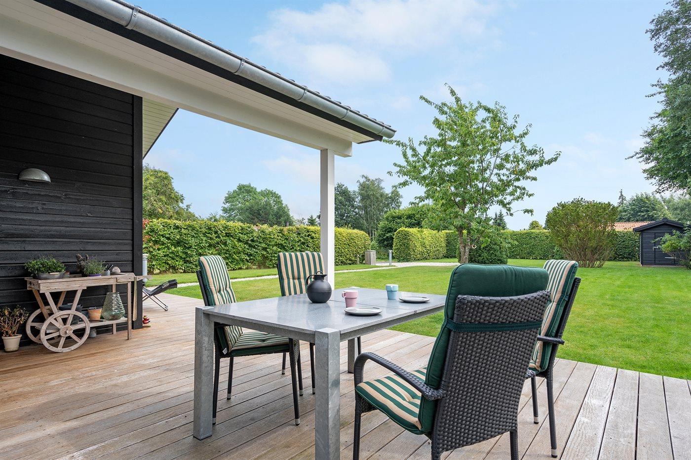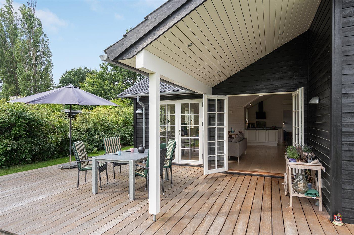 På den store træterrasse, hvor en del er overdækket, kan det gode vejr og udelivet nydes.