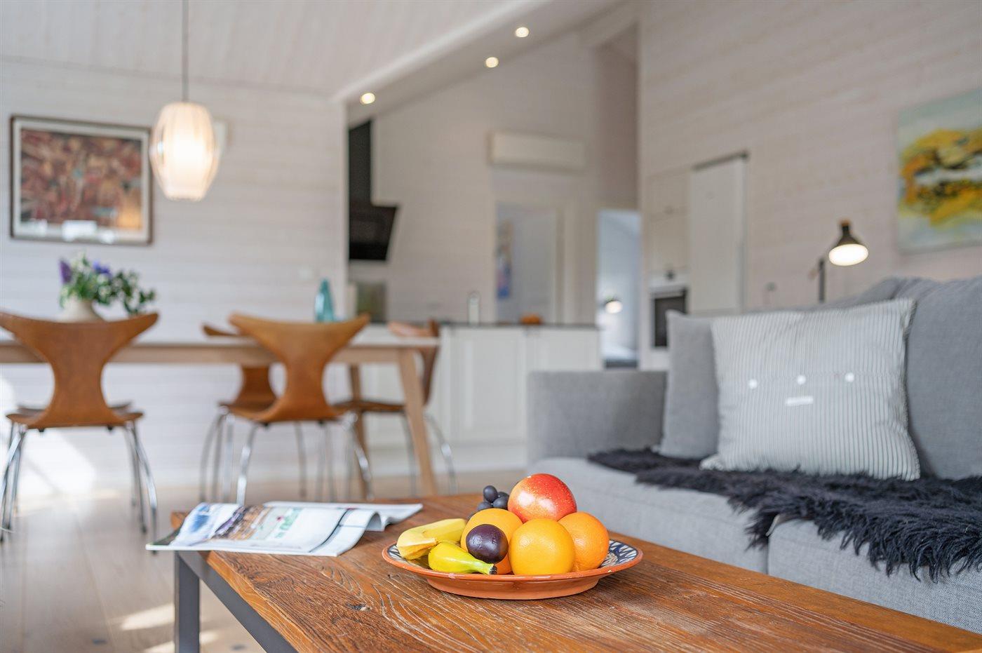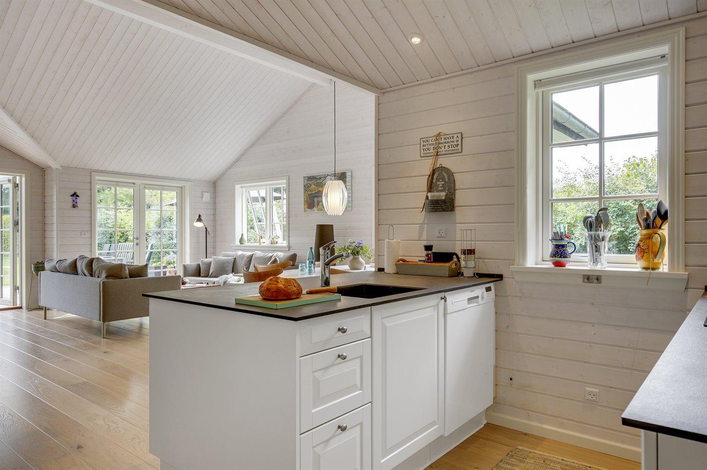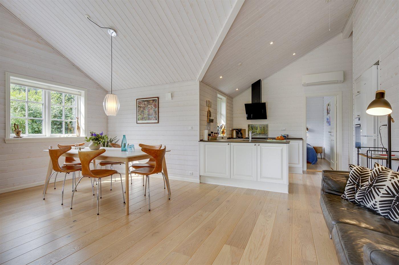 Huset er stilsikkert og smagfuldt indrettet, er opført i lyse materialer og byder på masser af lysindfald fra de store vinduespartier. Det naturlige samlingssted er det åbne køkken i forbindelse med spiseplads og stue, hvor der ligesom i resten af huset er loft til kip og derfor en god rumfornemmelse. Der er 3 rummelige soveværelser og 2 badeværelser med gulvvarme og bruseniche. I det ene badeværelse er der tillige en spa til 1 person.