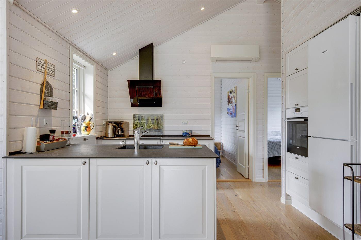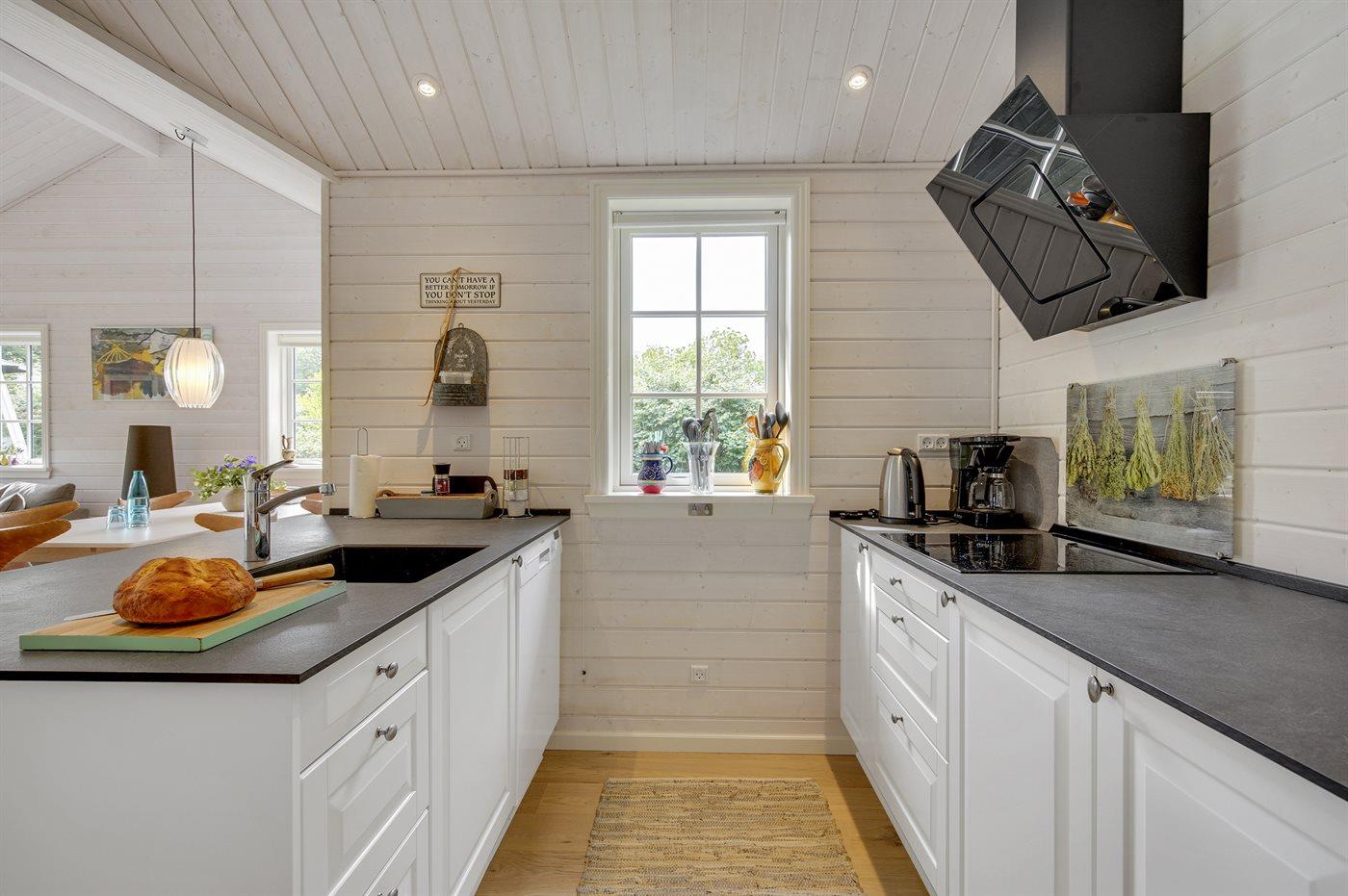 Køkkenet er udstyret med 1 køleskabe. Der er 4 keramiske kogeplader, varmluftovn samt opvaskemaskine Der findes ekstra køleskab samt mikrobølgeovn i husets bryggers.