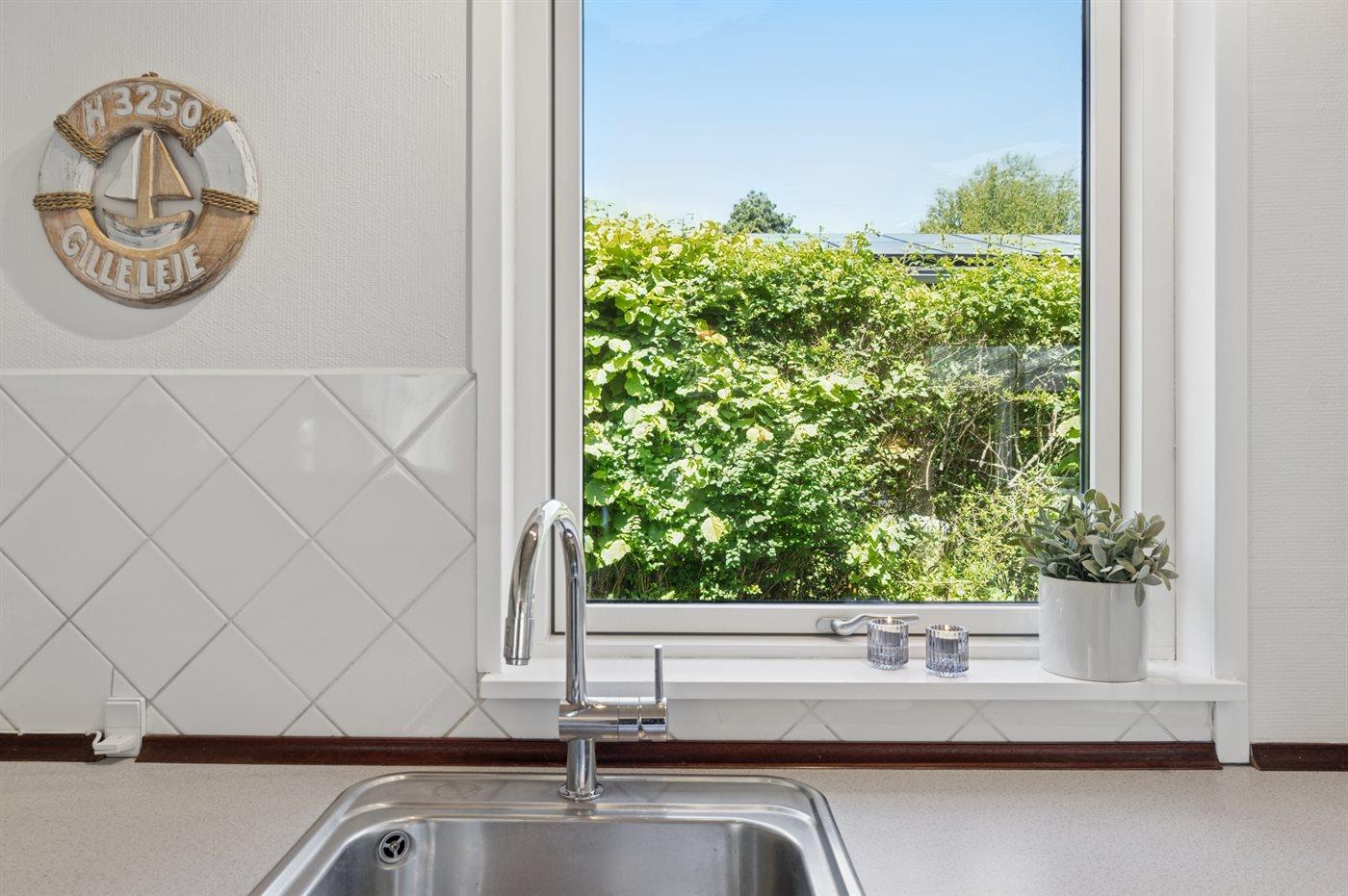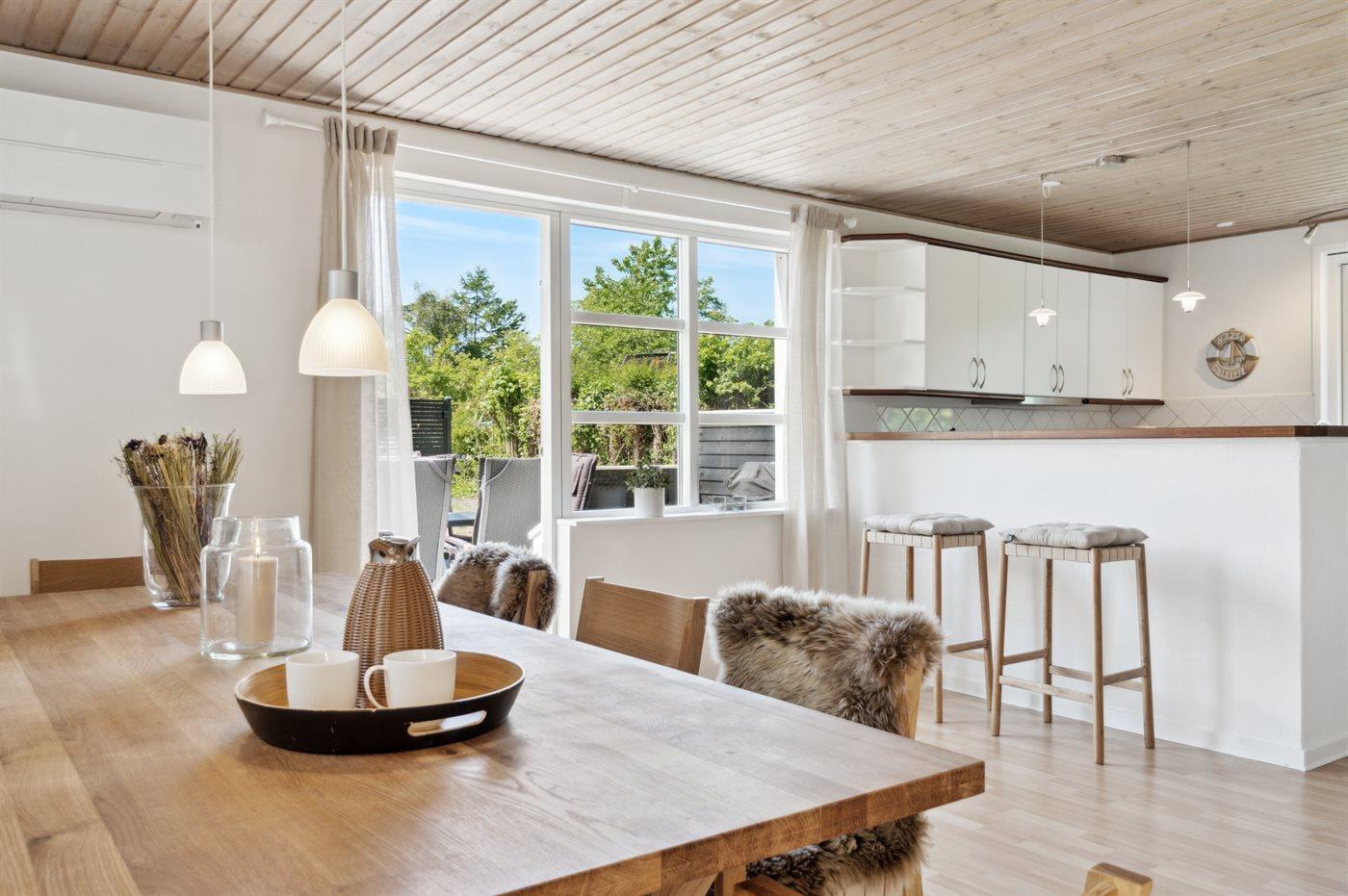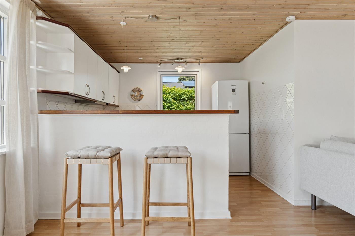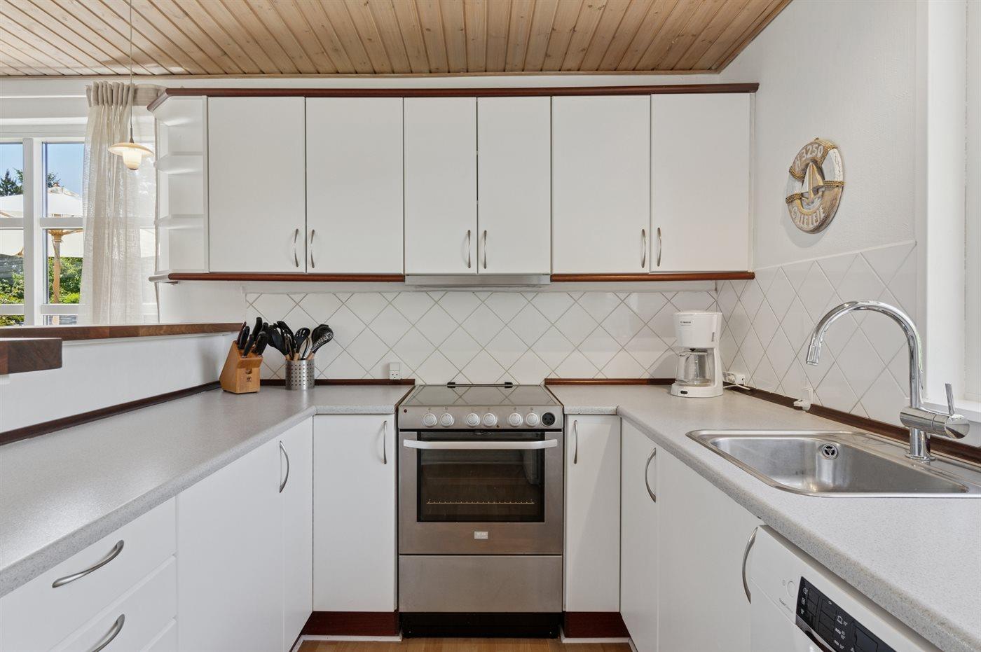 Køkkenet er udstyret med 1 køleskab. Der er 4 keramiske kogeplader, varmluftovn, mikrobølgeovn samt opvaskemaskine.