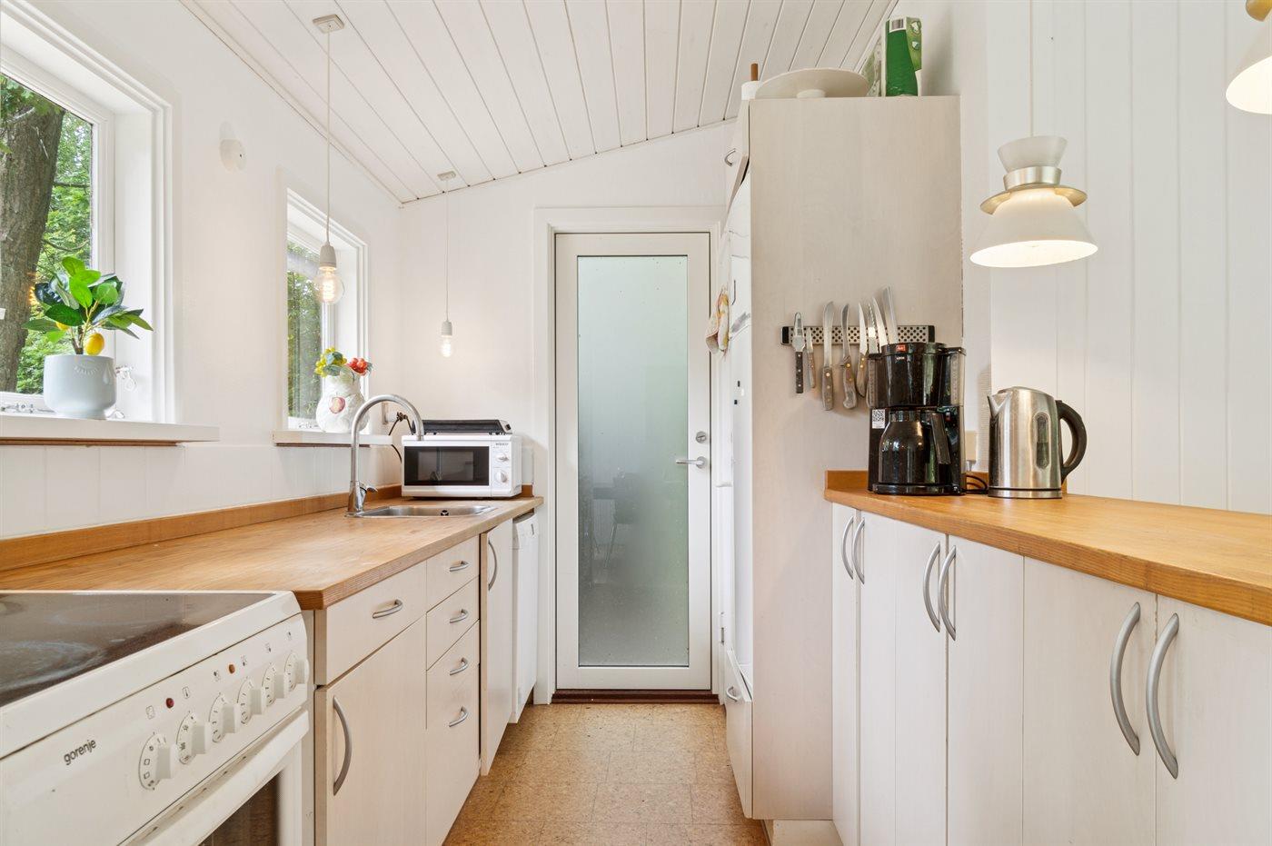 Køkkenet er udstyret med 1 køleskab. Der er 4 keramiske kogeplader, varmluftovn, mikrobølgeovn samt opvaskemaskine.