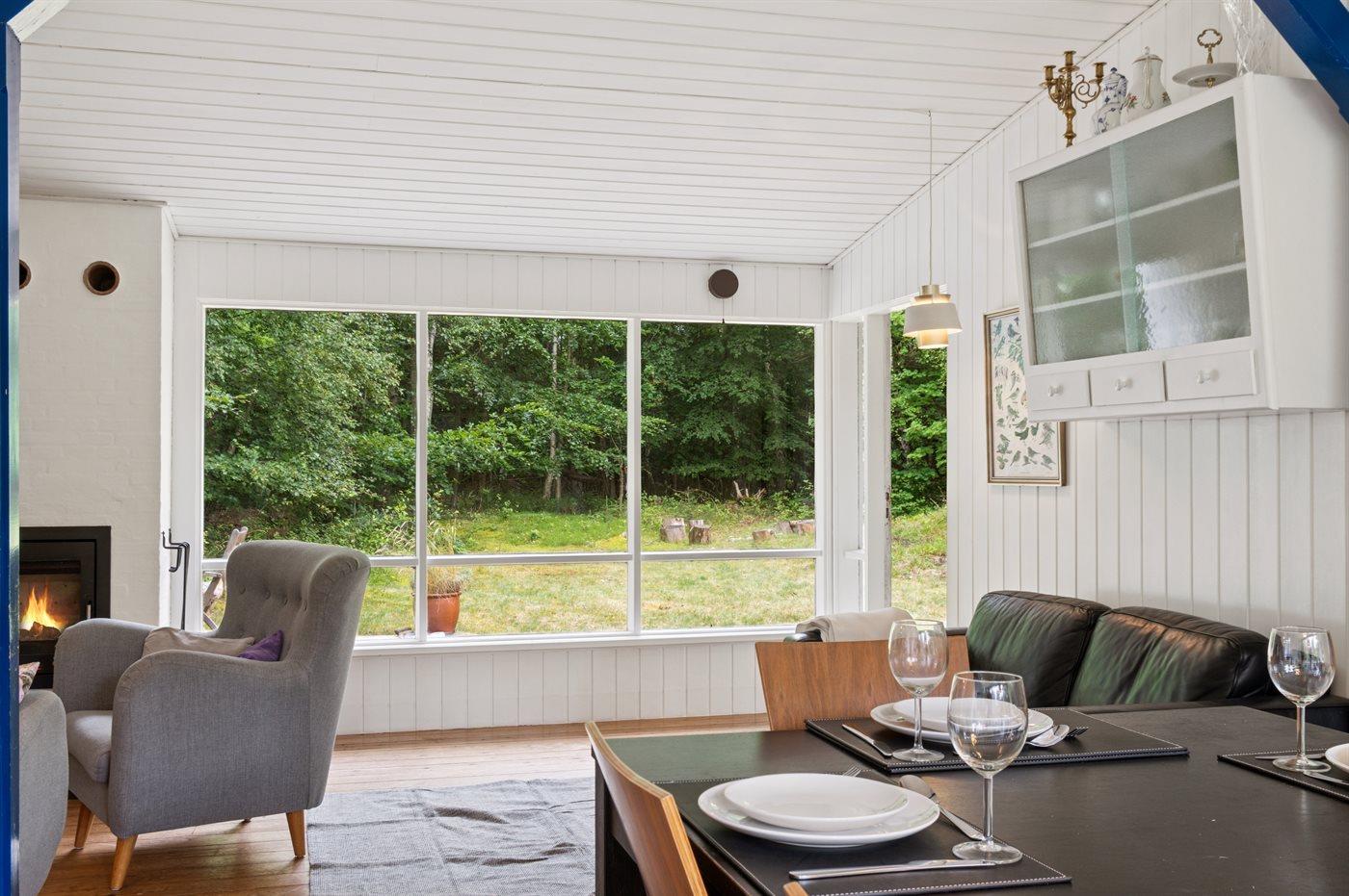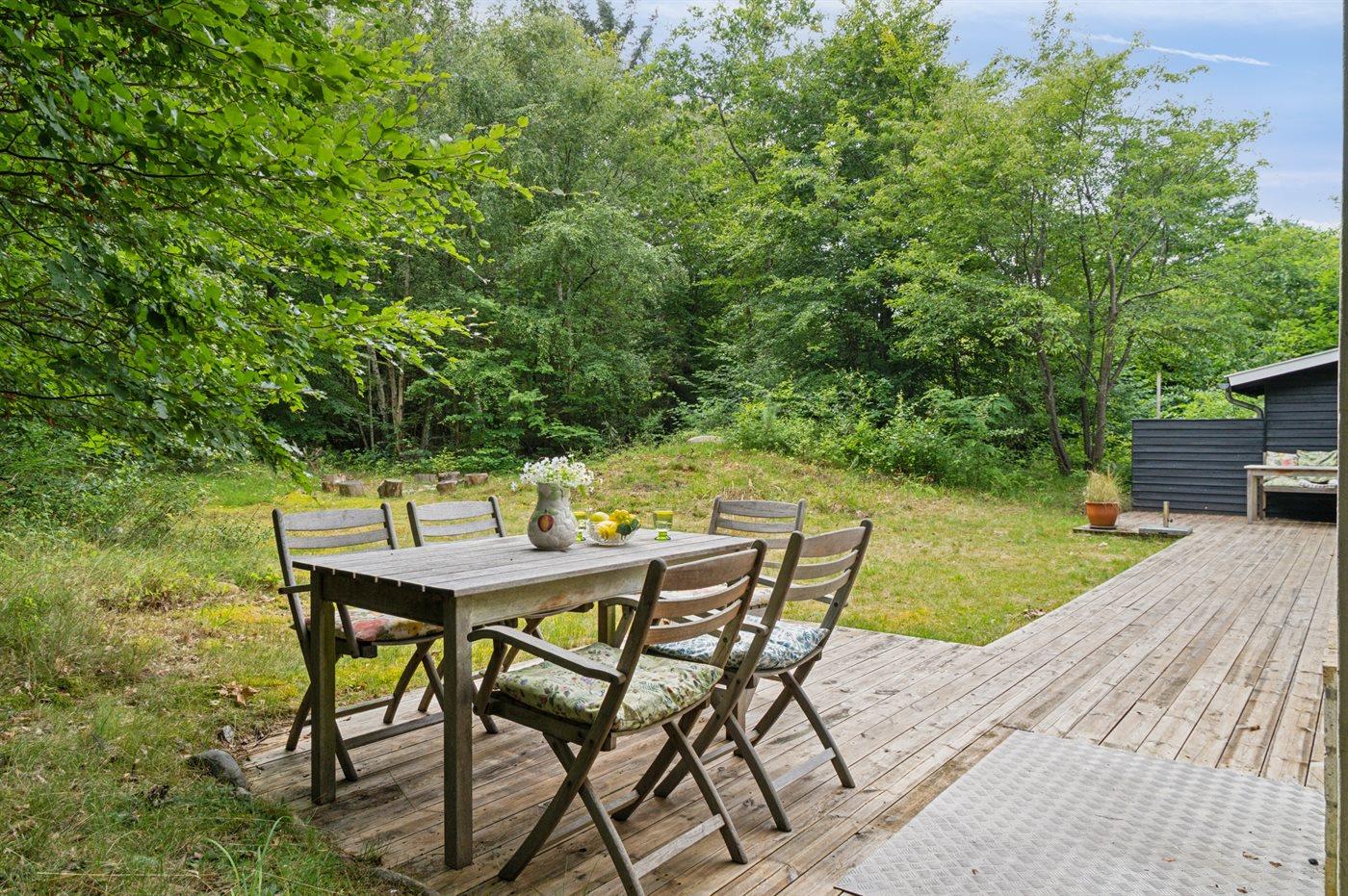 Ferieboligen er beliggende på en 4064 m² stor naturgrund. Der er 200 m til havet. Der er en badebro i nærheden. Nærmeste forretning er beliggende i en afstand af 400 m. Til ferieboligen hører 50 m² terrasseareal. Desuden er der 15 m² overdækket terrasse. Gynge. Rutchebane. Bålsted. Udendørs bruser. På lune aftener sørger en udendørs pejs for hyggelig stemning. Grill til rådighed. Parkering ved ferieboligen.