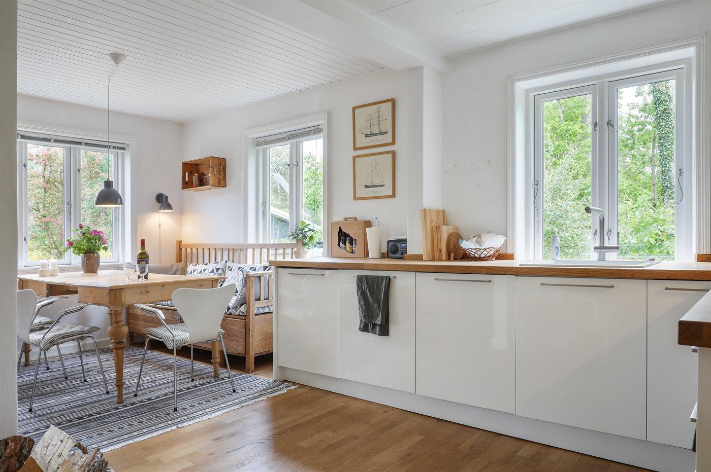 Køkkenet er udstyret med 1 køleskab. Der er 4 keramiske kogeplader, varmluftovn samt opvaskemaskine.