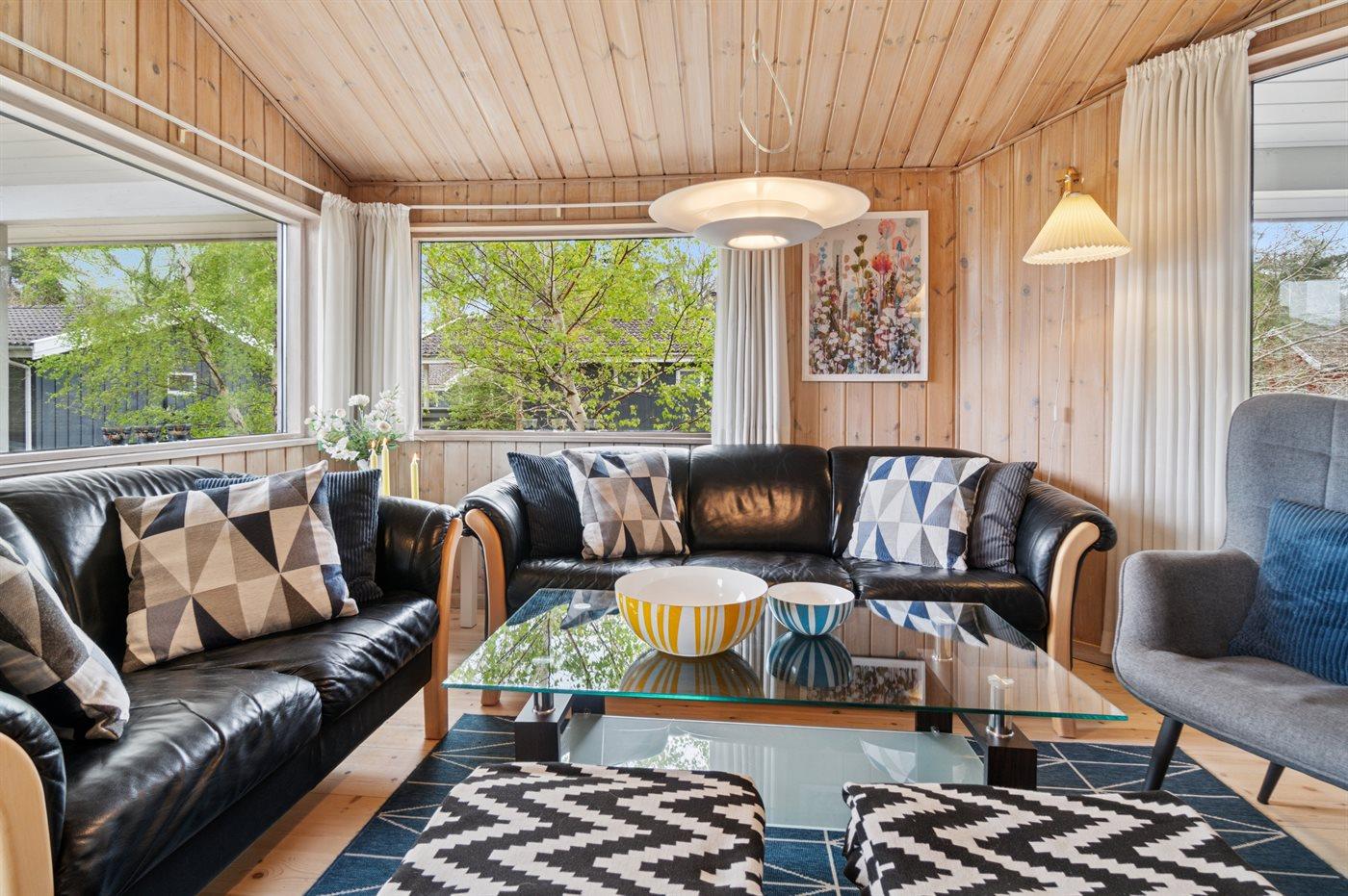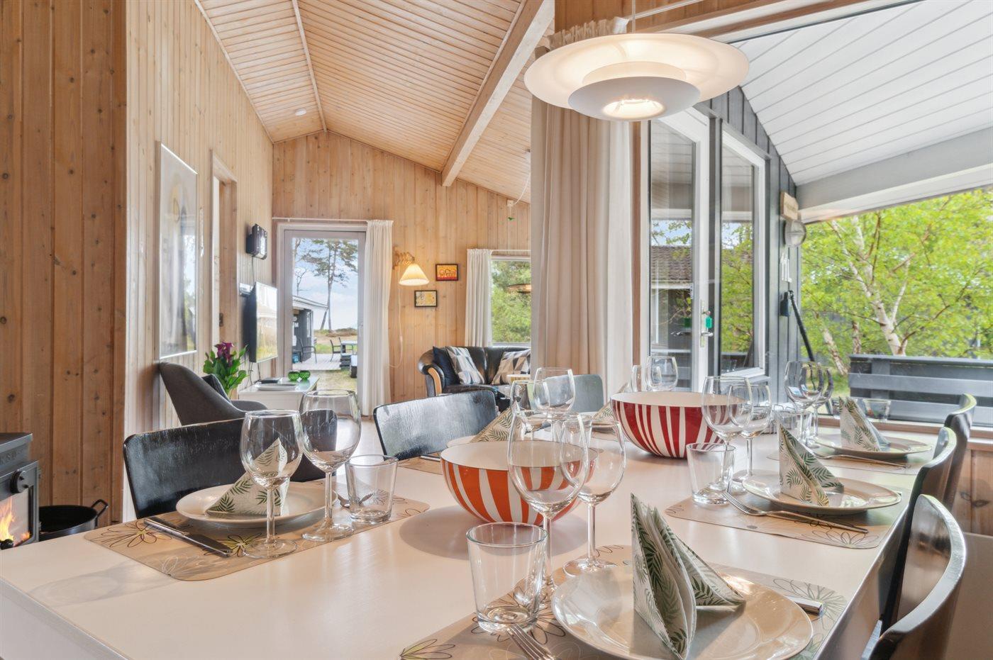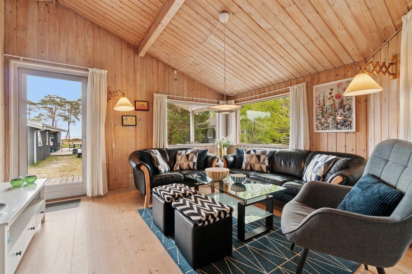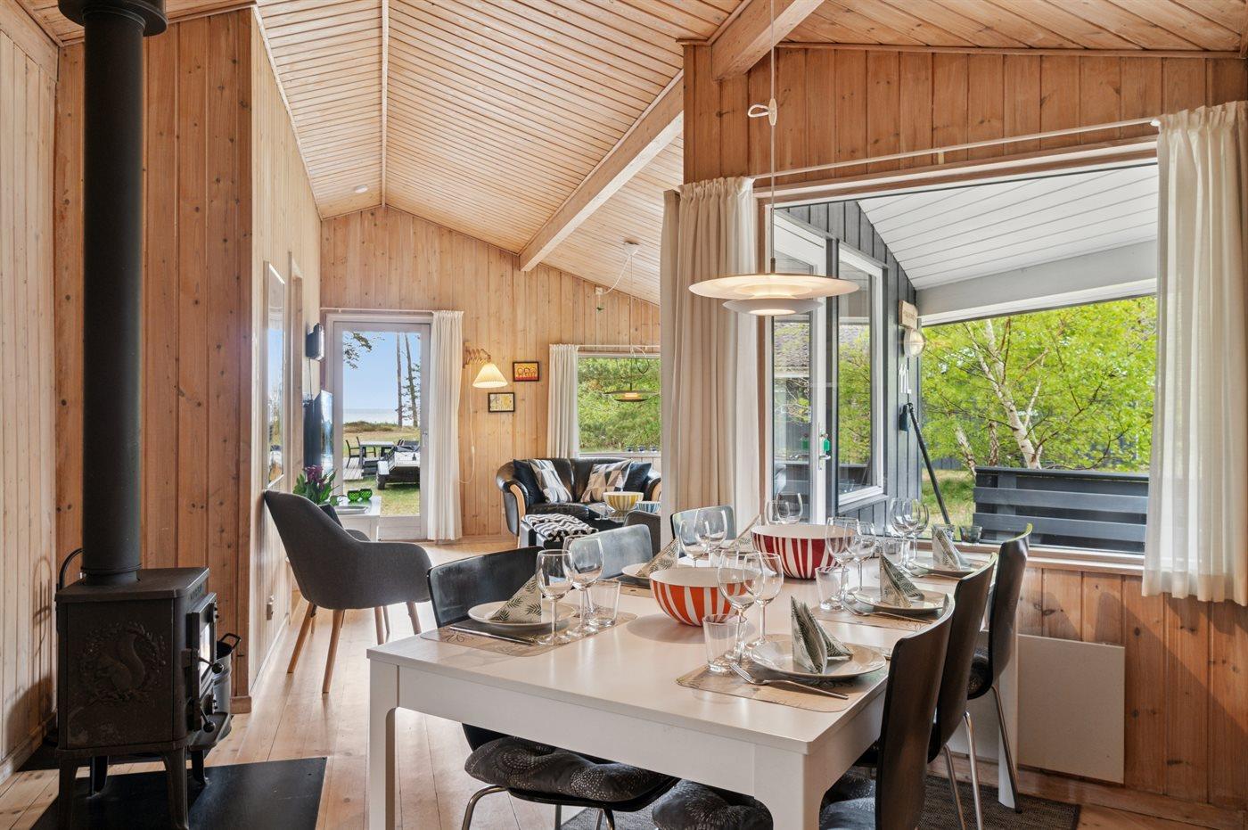 Huset fremstår pænt og velholdt og man fornemmer straks ved ankomst, at det er et hus der bliver plejet af ejerne, netop fordi de ønsker, at alle skal have en behagelig og afslappende ferie. Huset er indrettet på samme måde, som de andre feriehuse i Strandbo-bebyggelsen - med plads til 8 personer - stue og spiseafdeling er kombineret med åbent køkken, der rummer de faciliteter, der skal til, når man skal lave mad til hele familien. I det store badeværelse er der adgang til såvel sauna som spa.