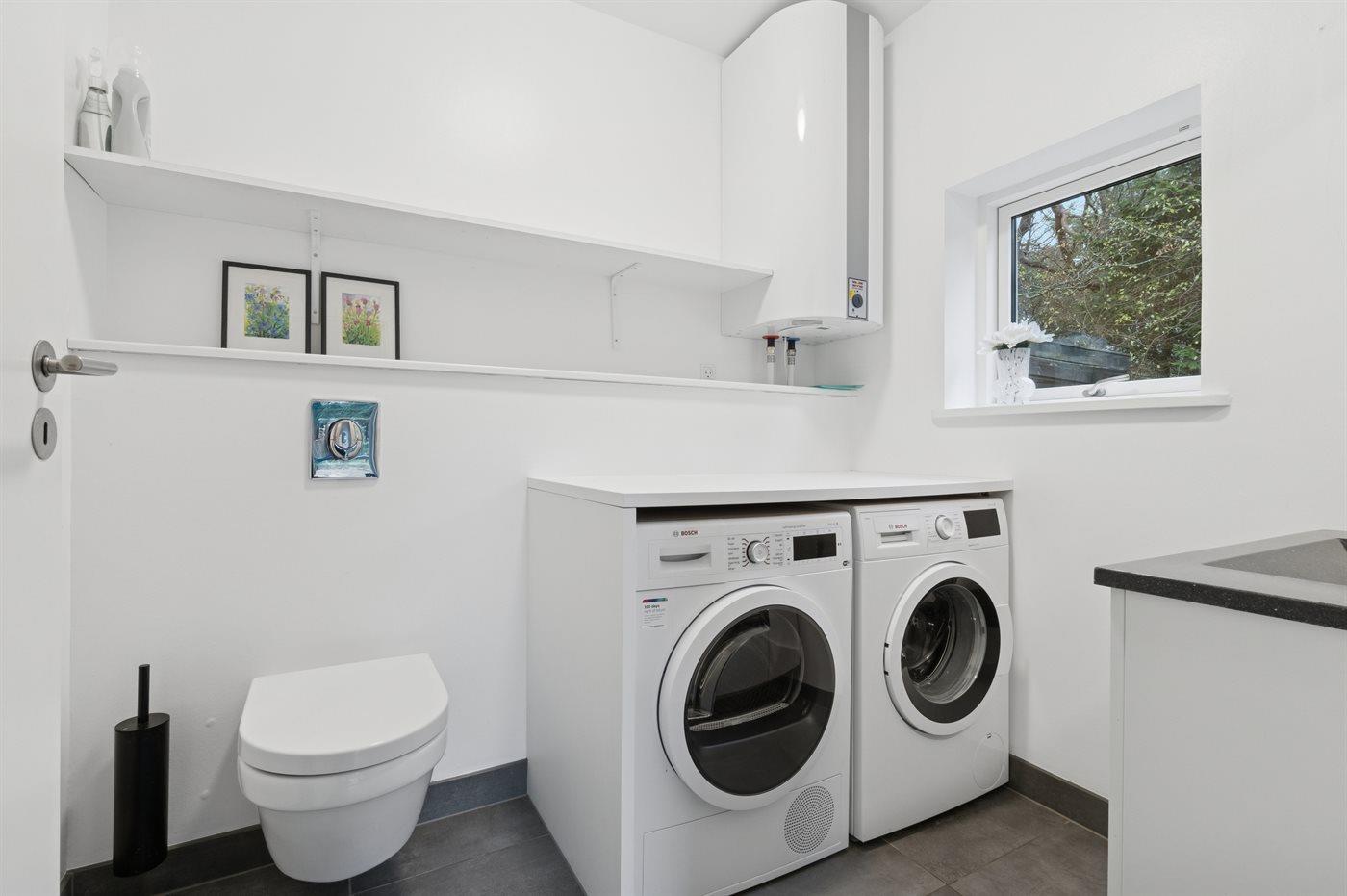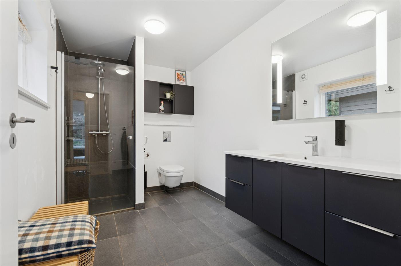 Der er 1 badeværelse med bruseniche og 2 toiletter, heraf 1 gæstetoilet. Der er gulvvarme på 1 badeværelse. Der er gulvvarme på gæstetoilettet.