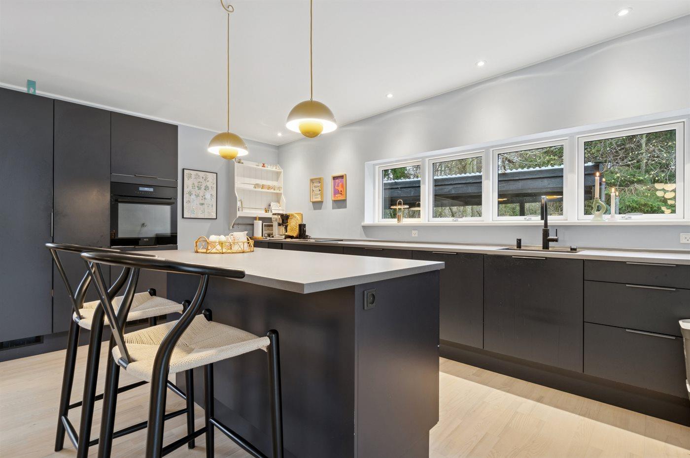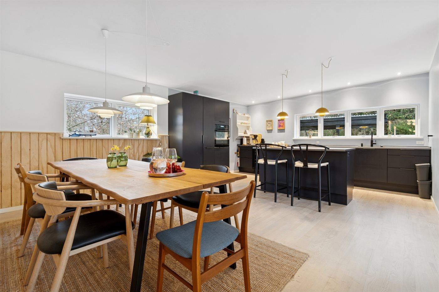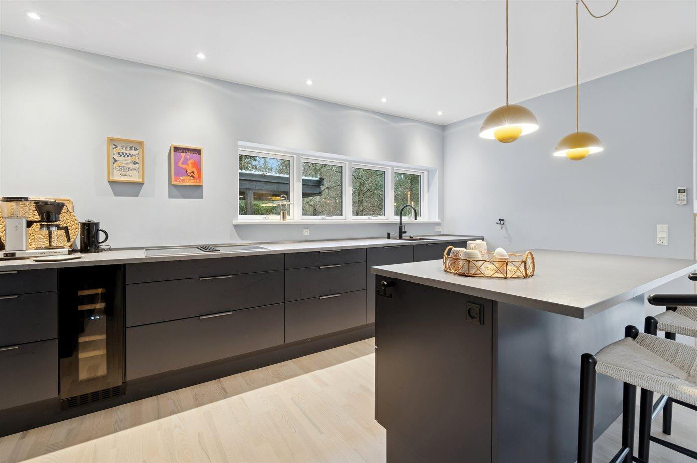 Køkkenet er udstyret med 1 køleskab. Der er 4 induktionskogeplader, varmluftovn, mikrobølgeovn samt opvaskemaskine.