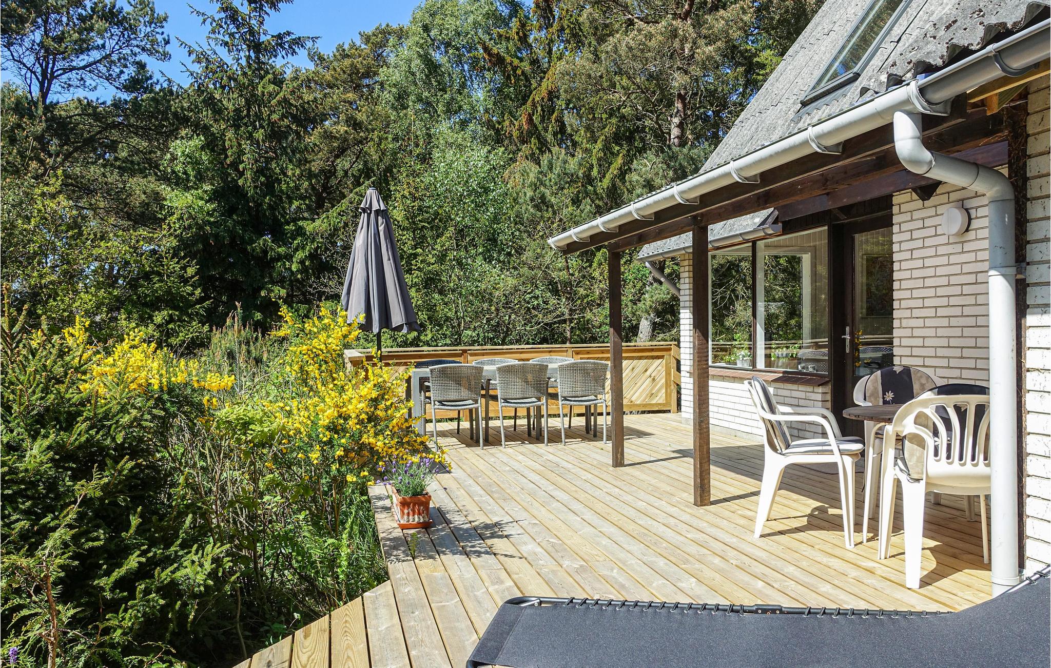 Indbydende feriehus i to plan nær Snogebæk Strand med terrasse, brændeovn og skøn naturgrund.